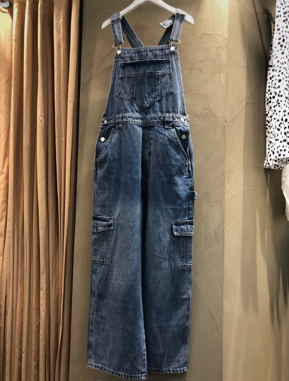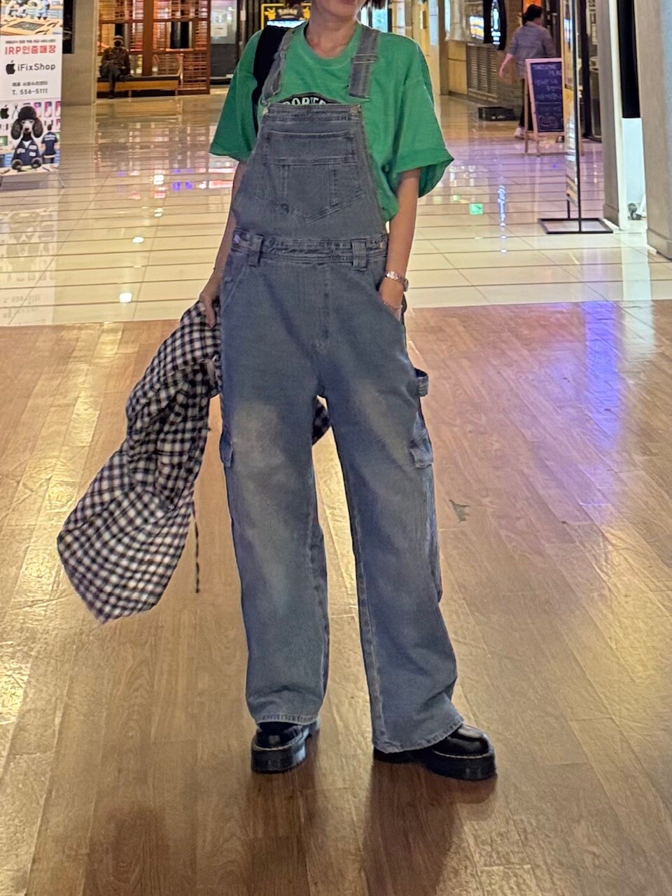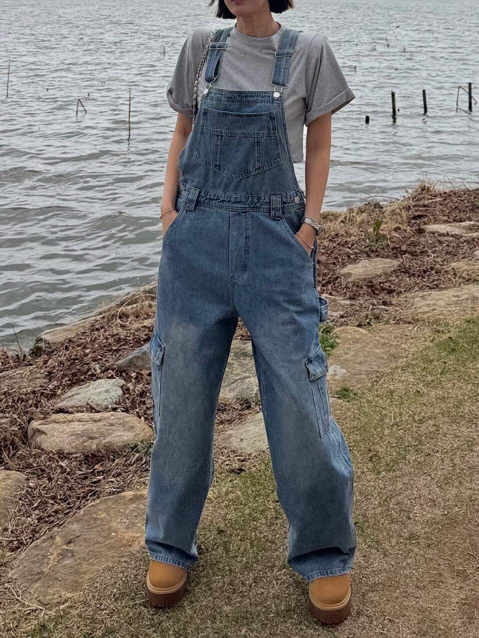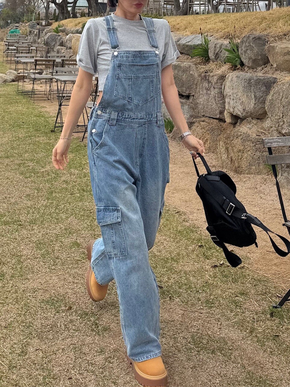 카고 포켓 오버롤 청 팬츠
