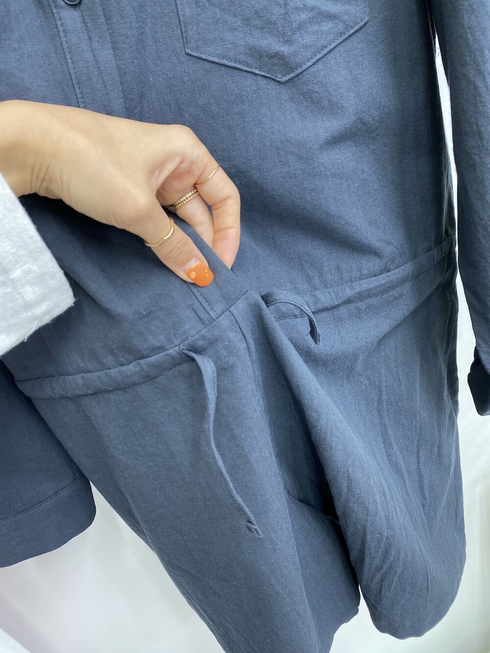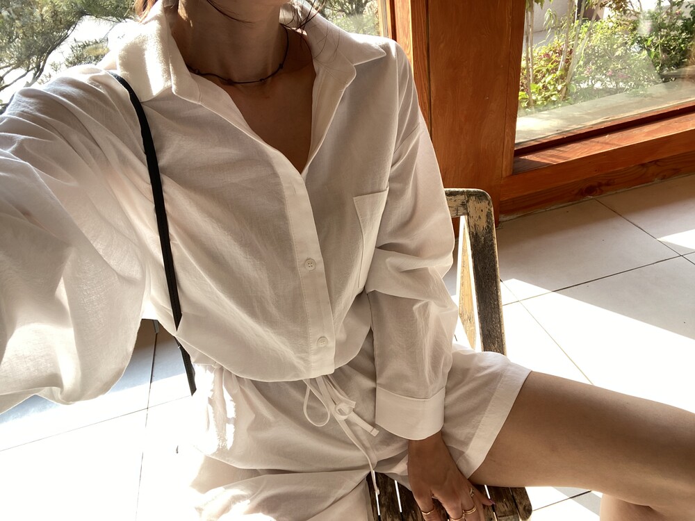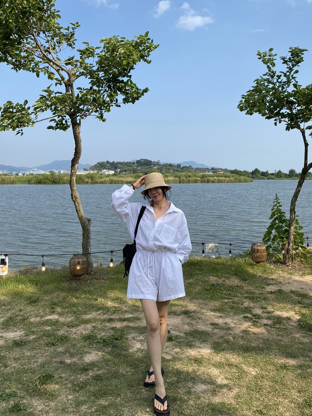 부드러운 린넨 원단의 셔츠 형식의 점프수트예요