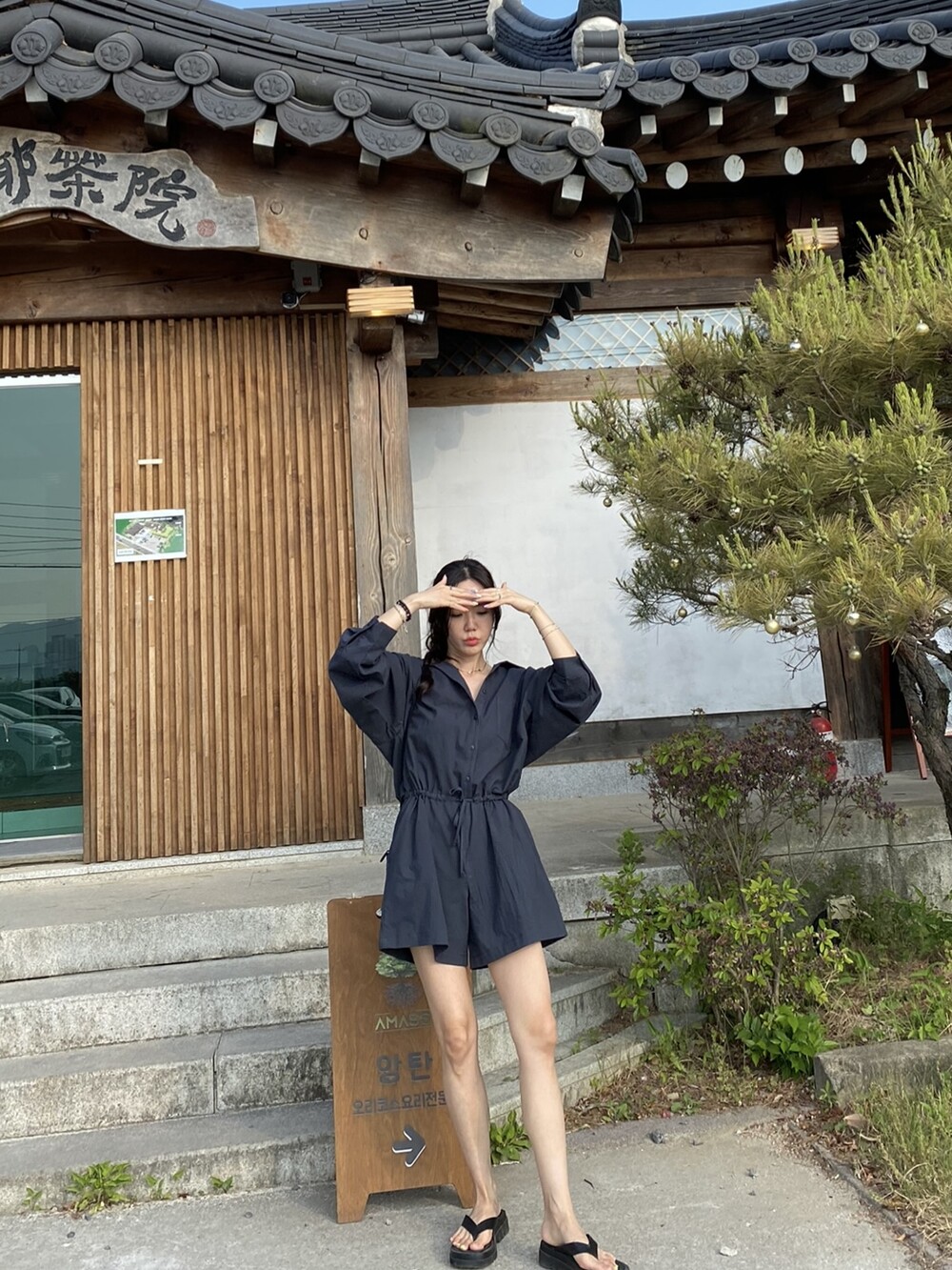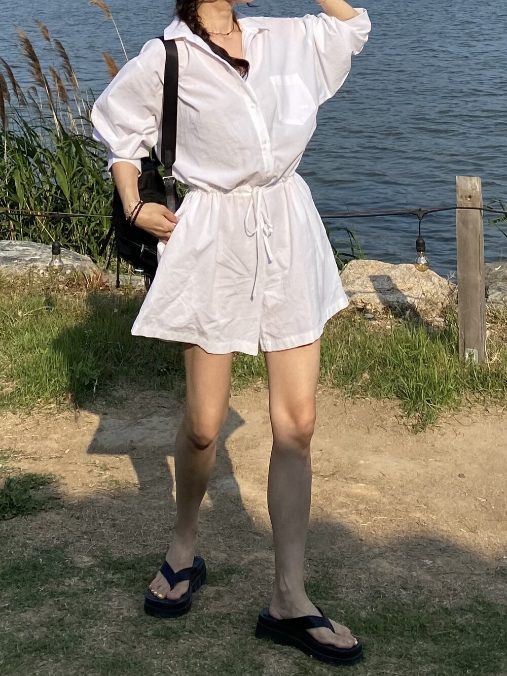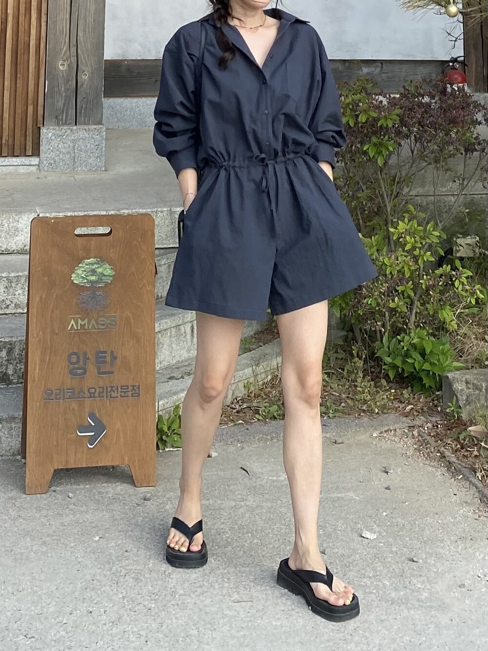 린넨원단의 셔츠 점프수트