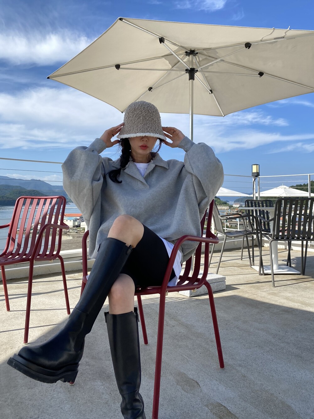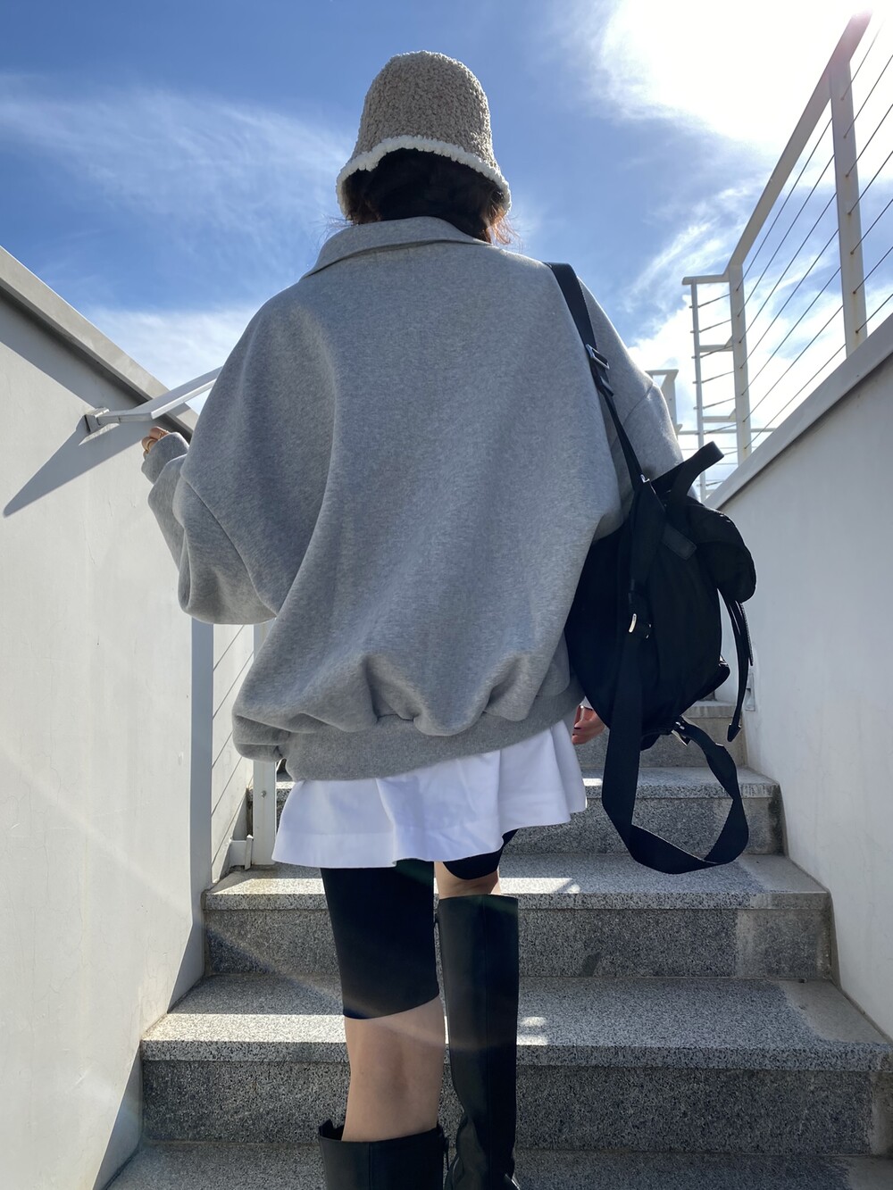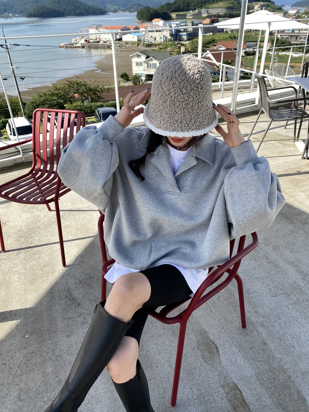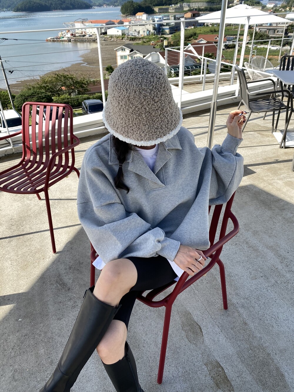배색 뽀글이 버킷햇이예요