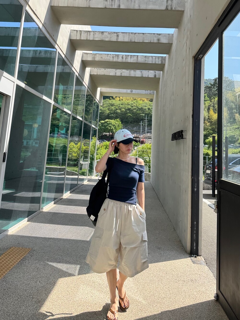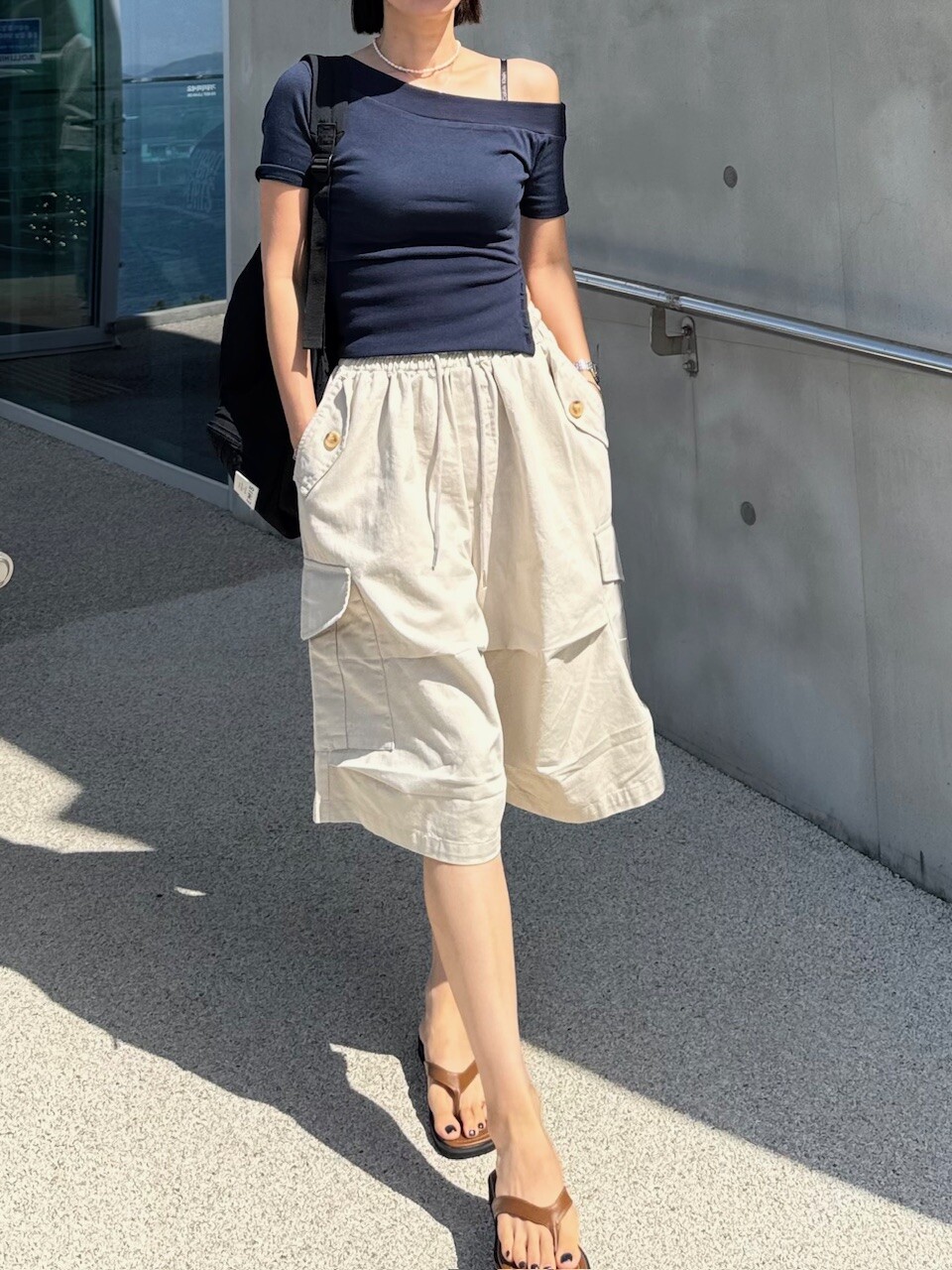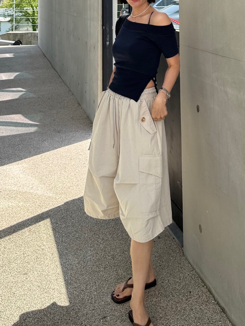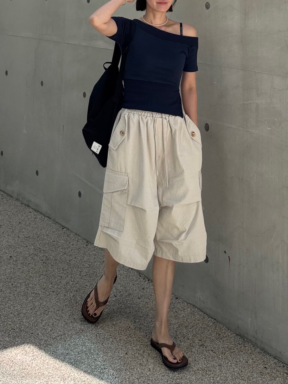루즈한 핏감의 카고 버뮤다 밴딩팬츠예요