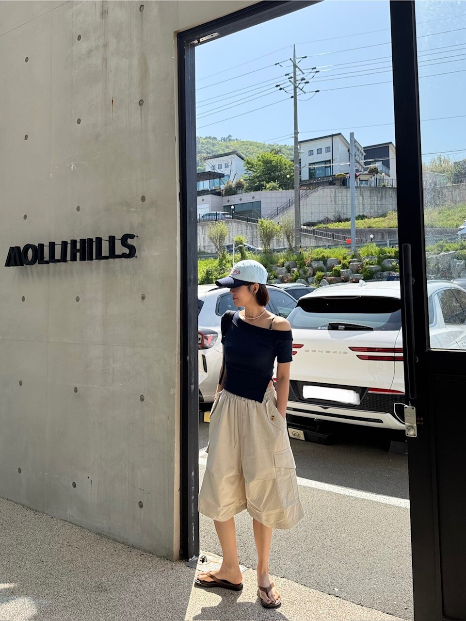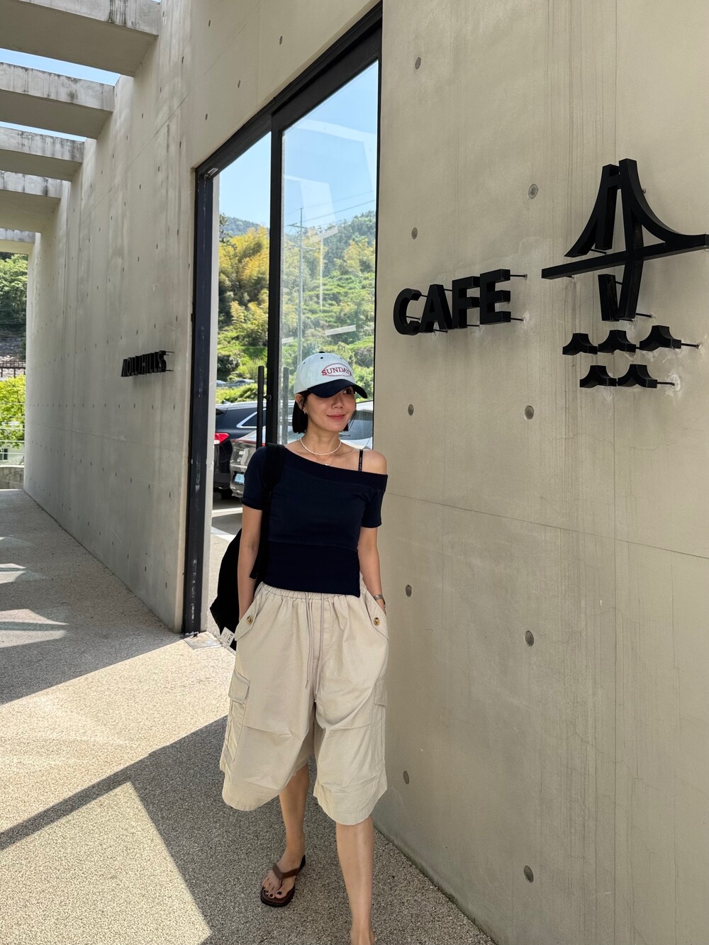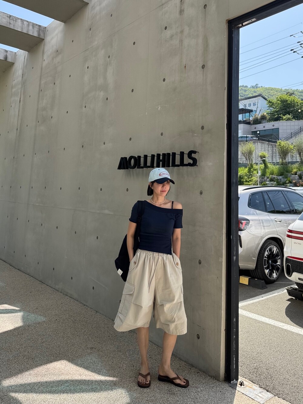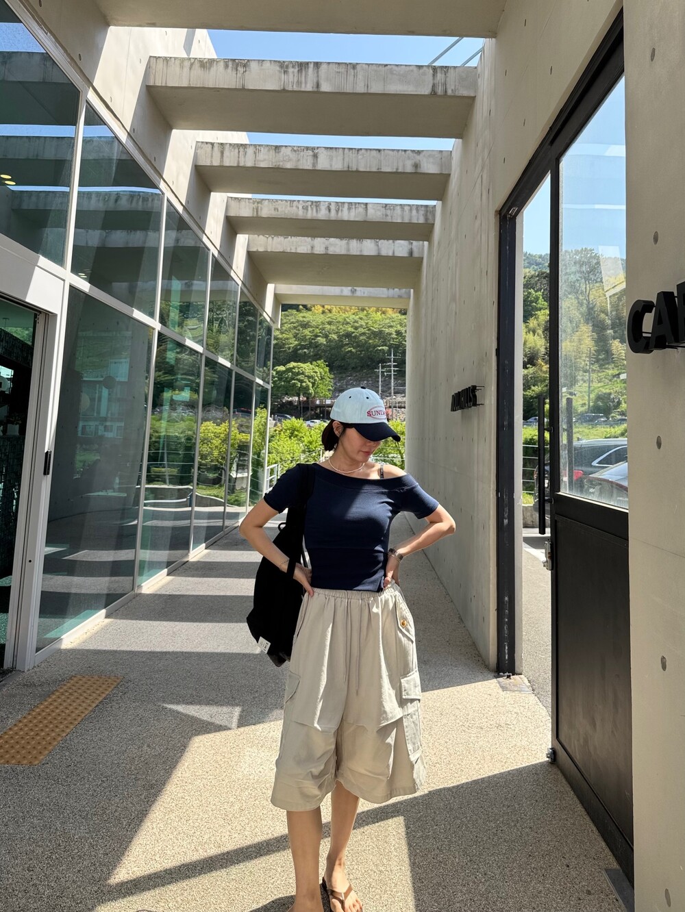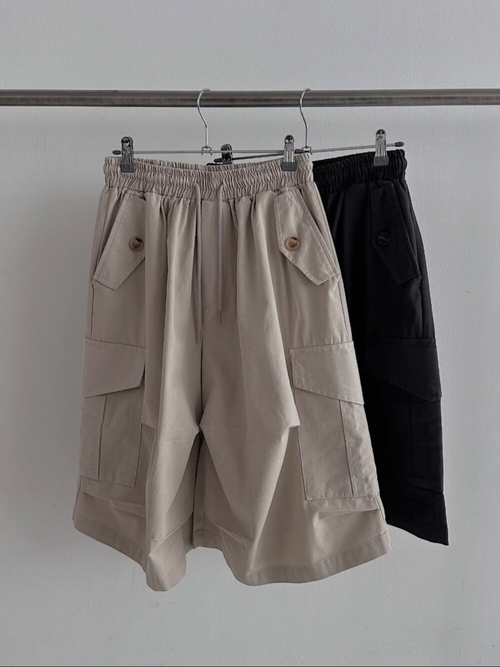 루즈한 핏감의 카고 버뮤다 밴딩팬츠예요