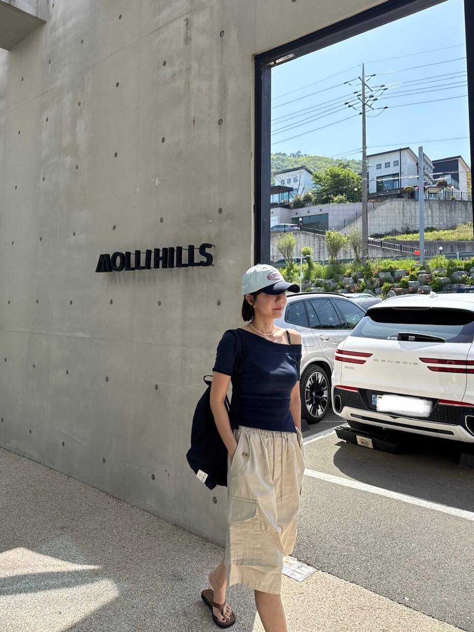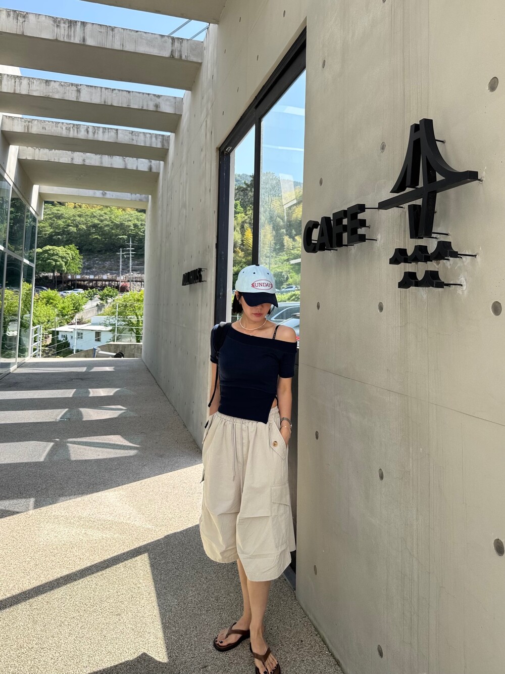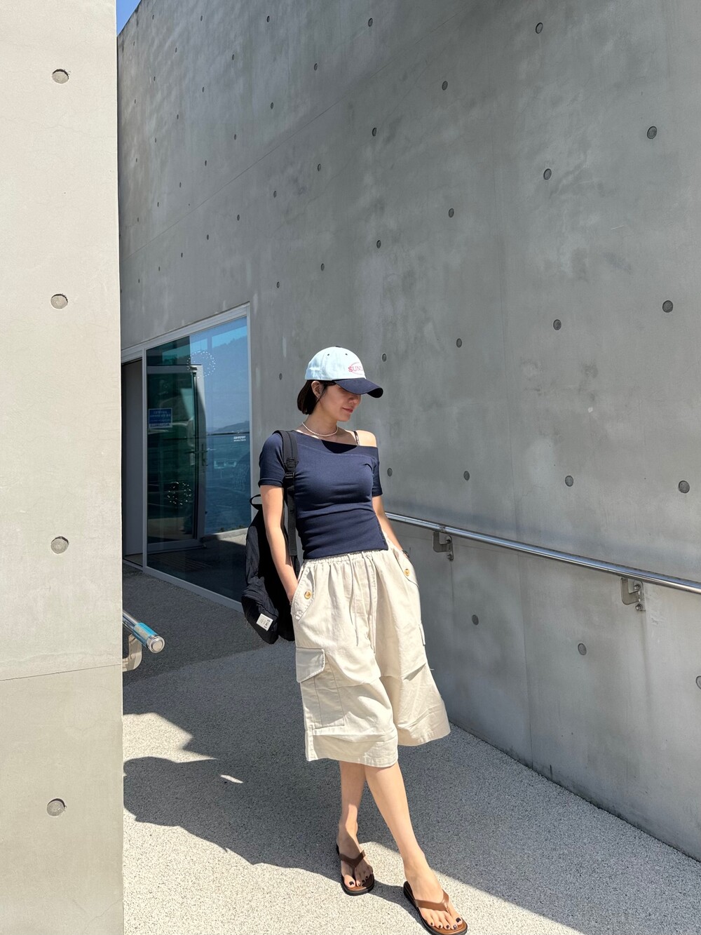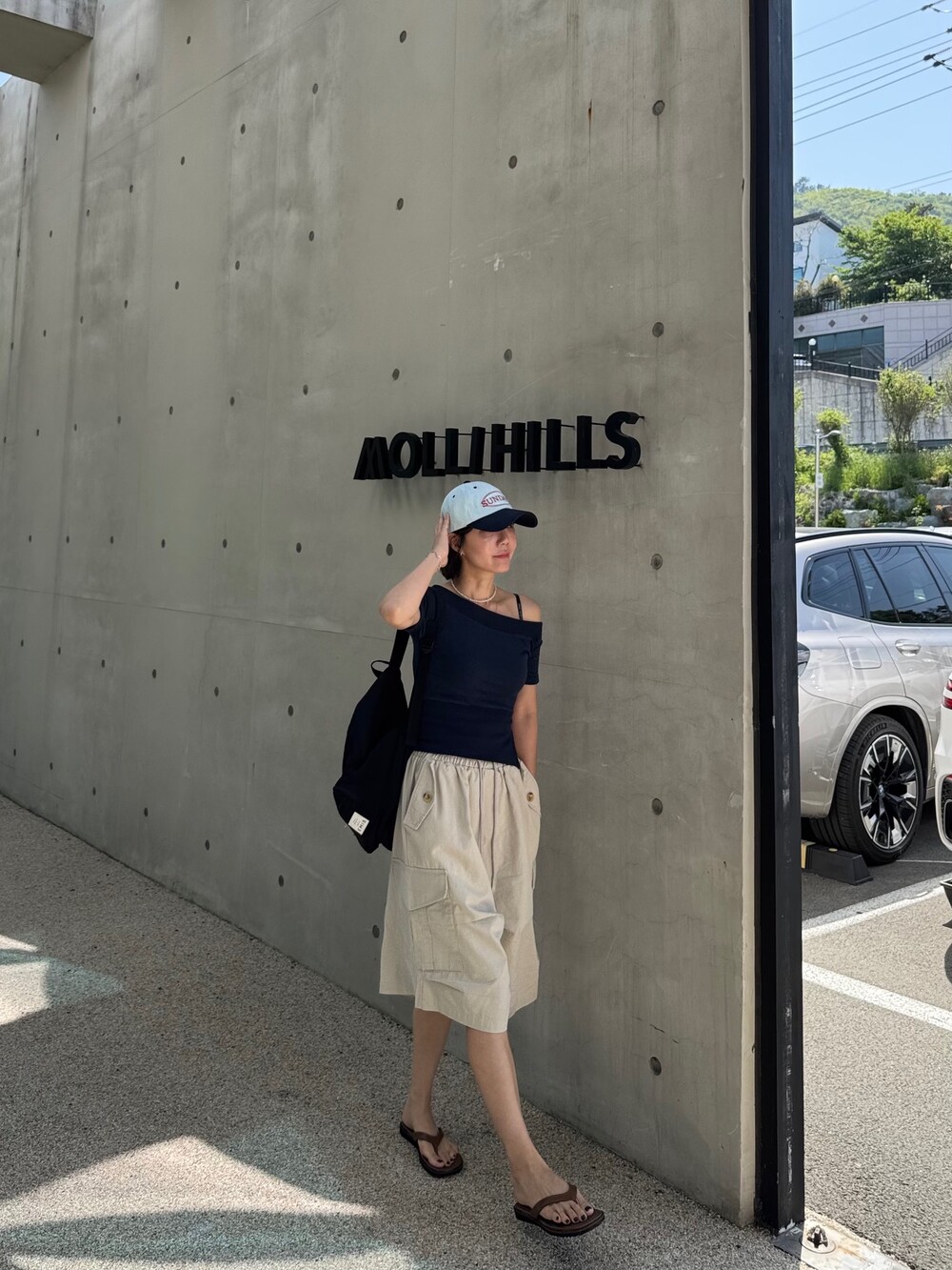 루즈한 핏감의 카고 버뮤다 밴딩팬츠예요