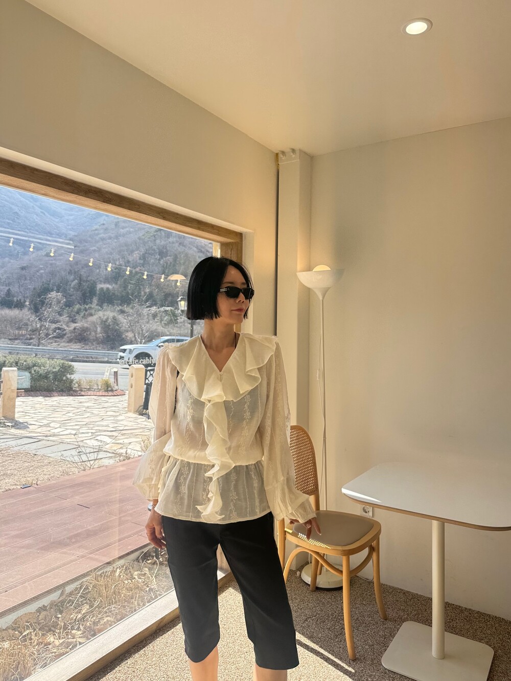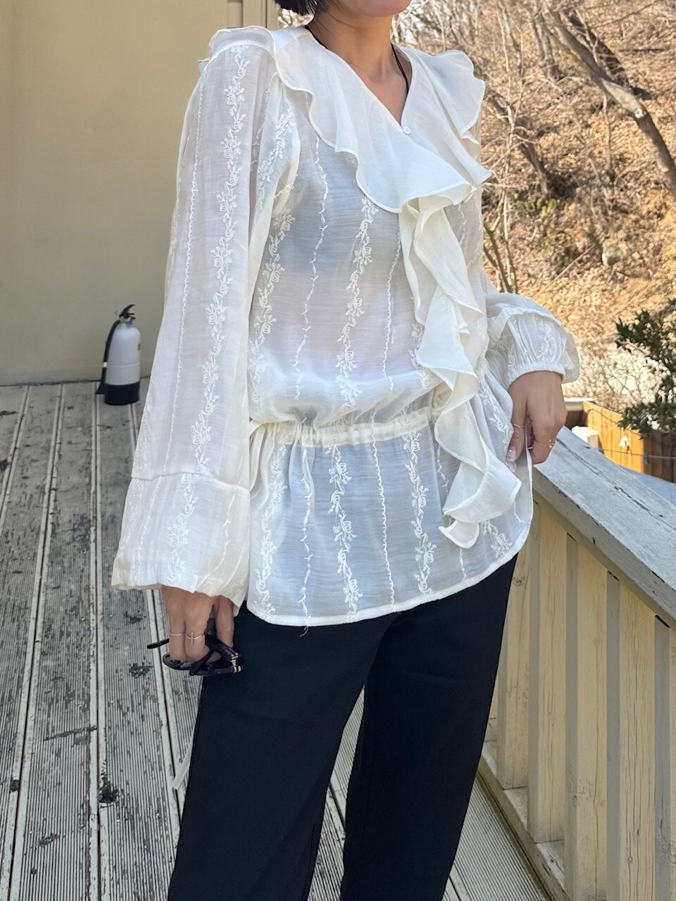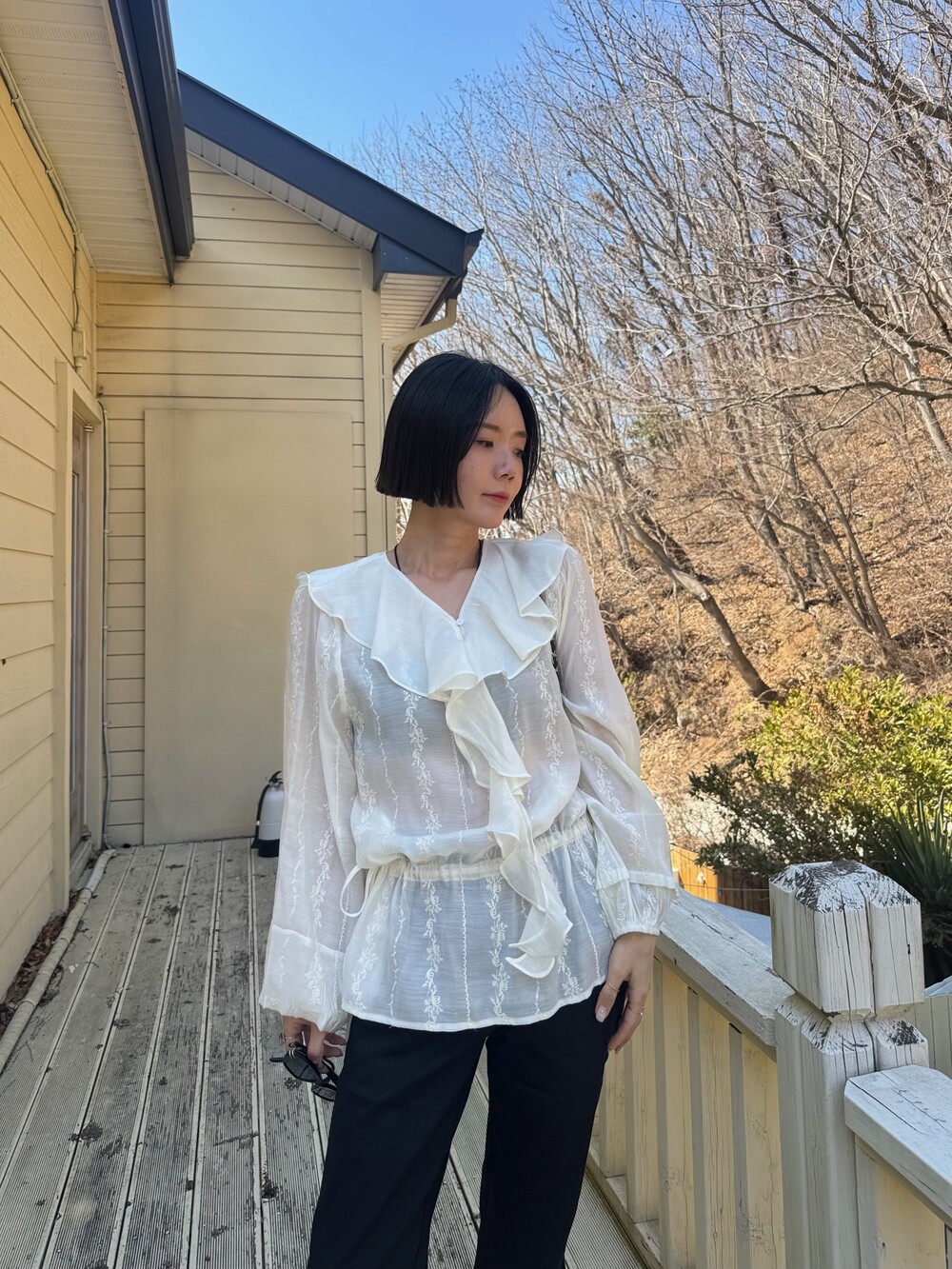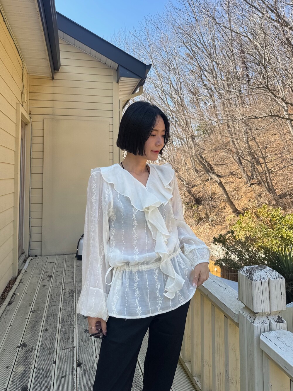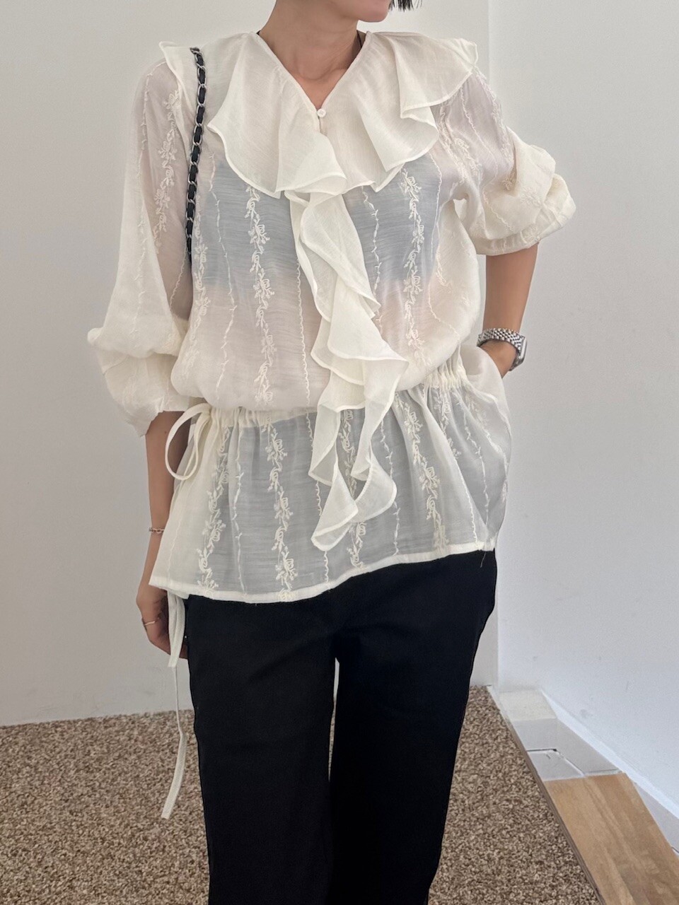 풍성한 프릴 디테일로 얼굴선을 화사하게 살려주고