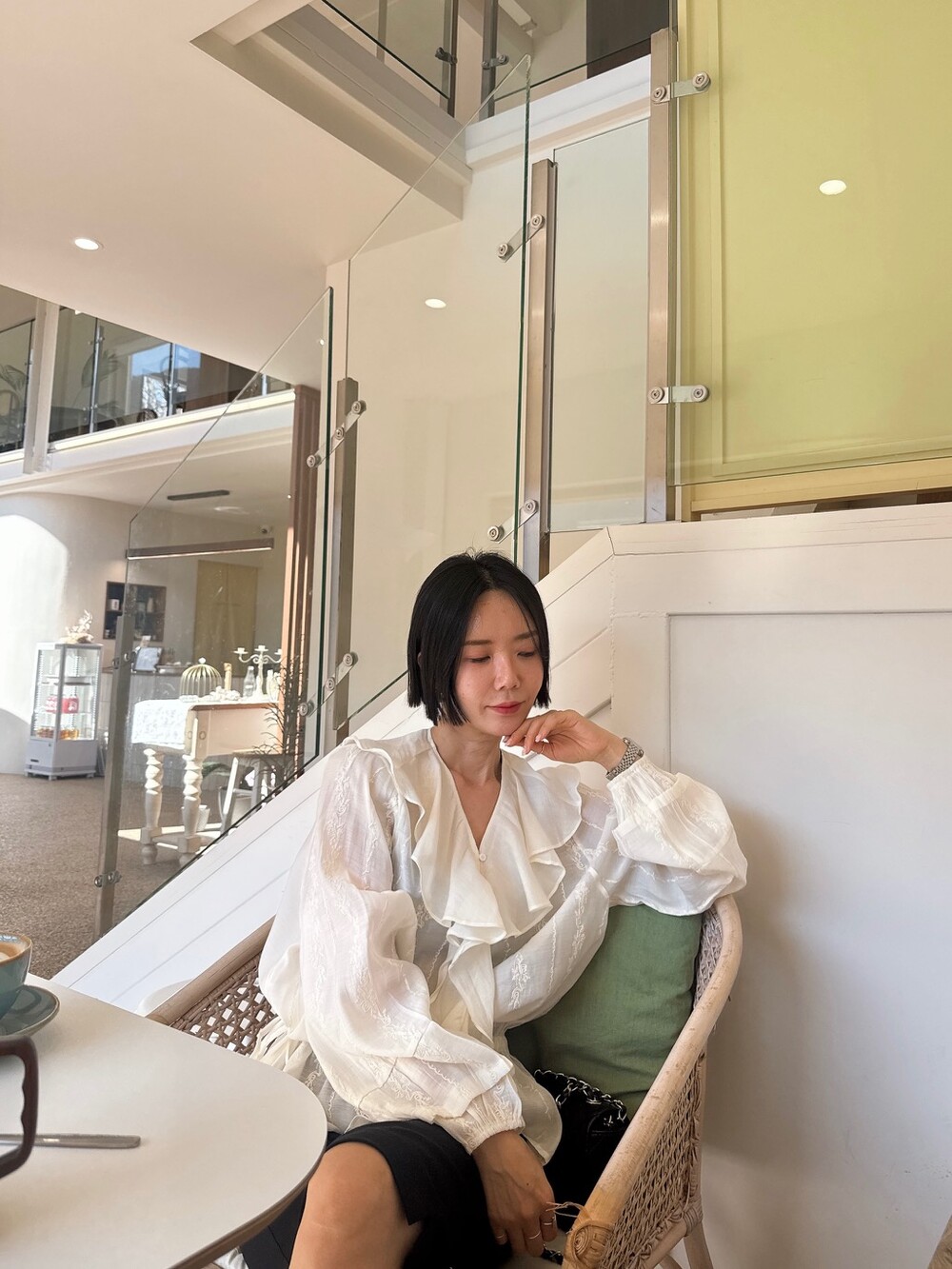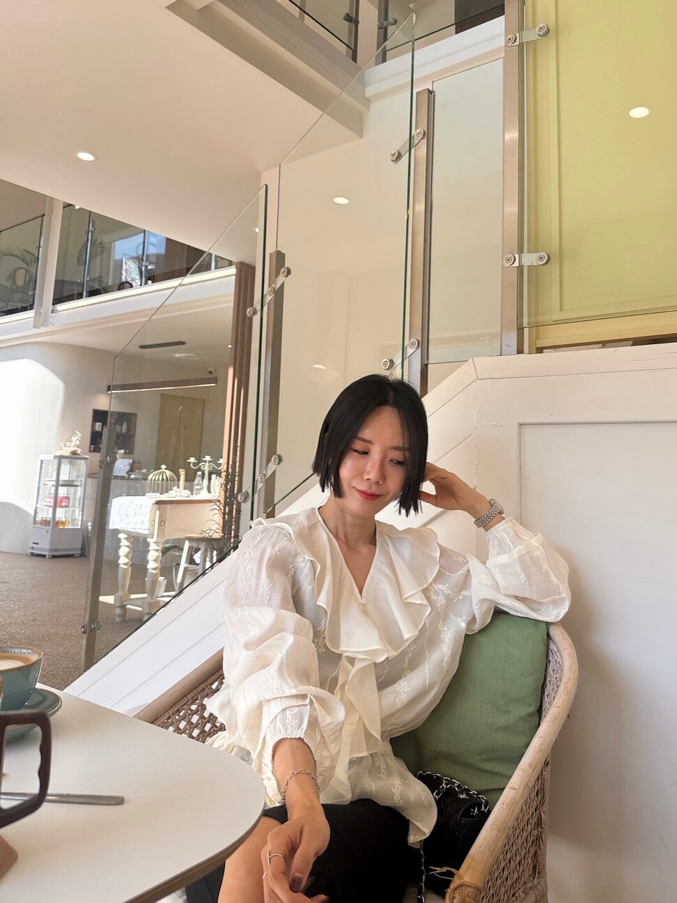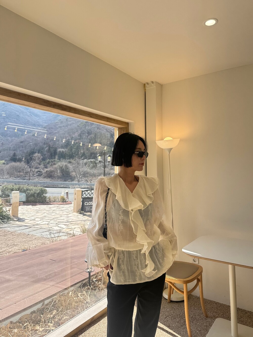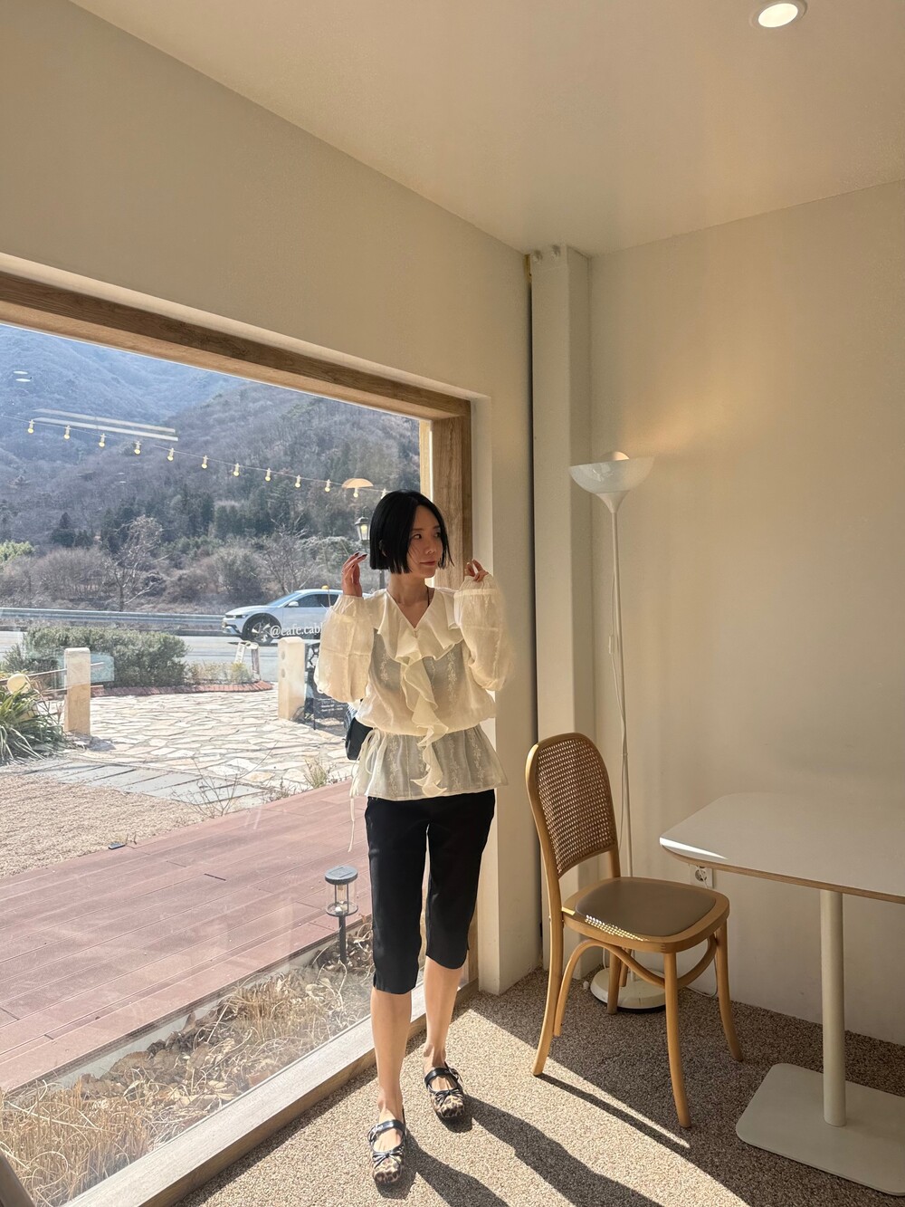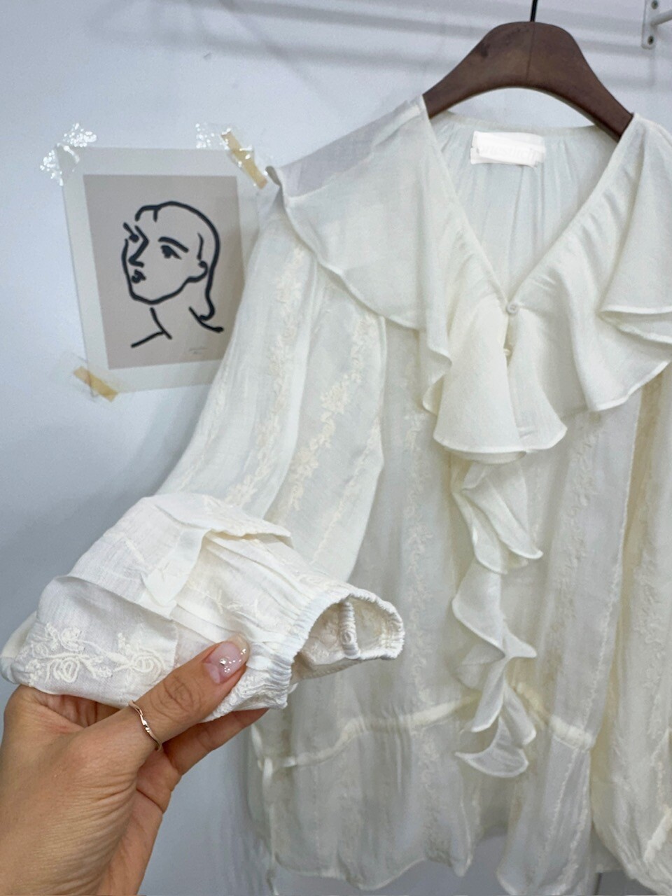 풍성한 프릴 디테일로 얼굴선을 화사하게 살려주고
