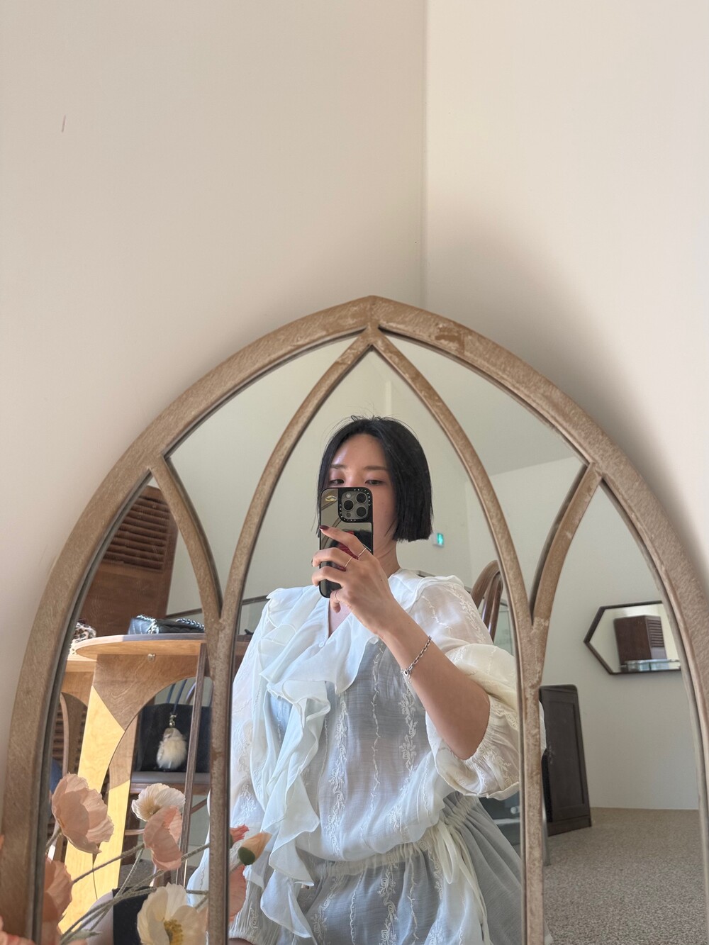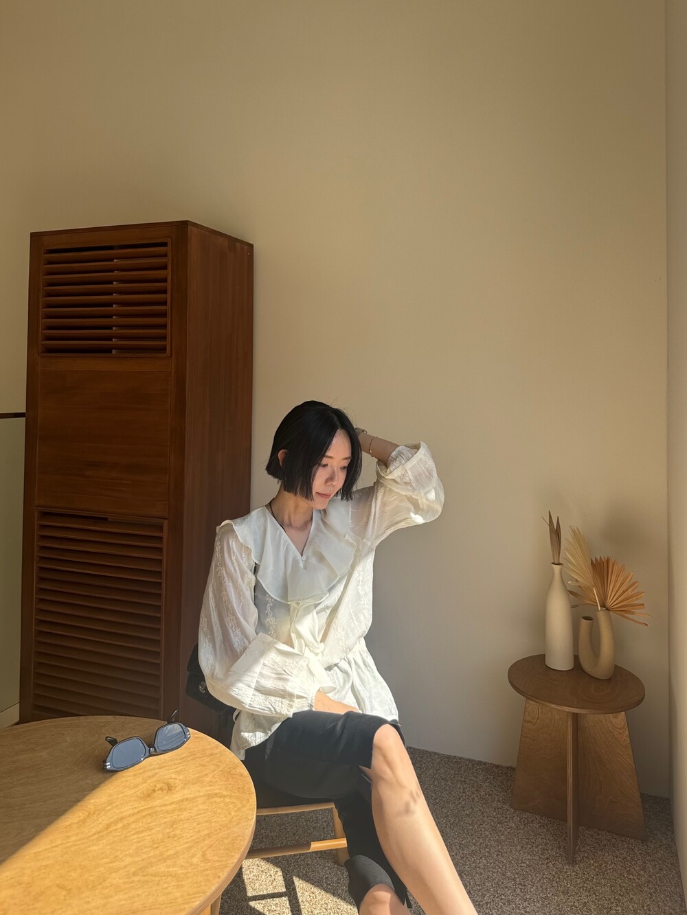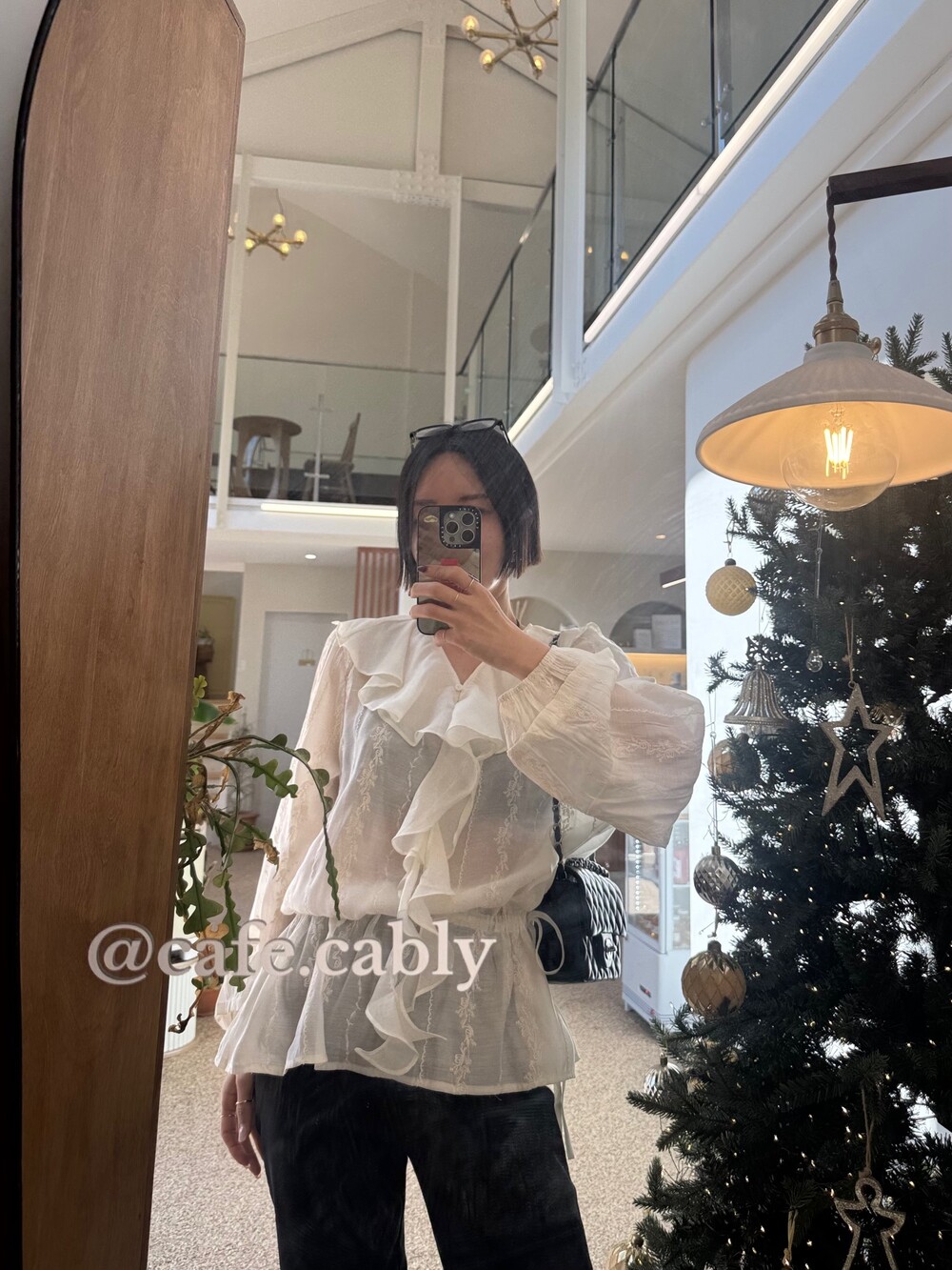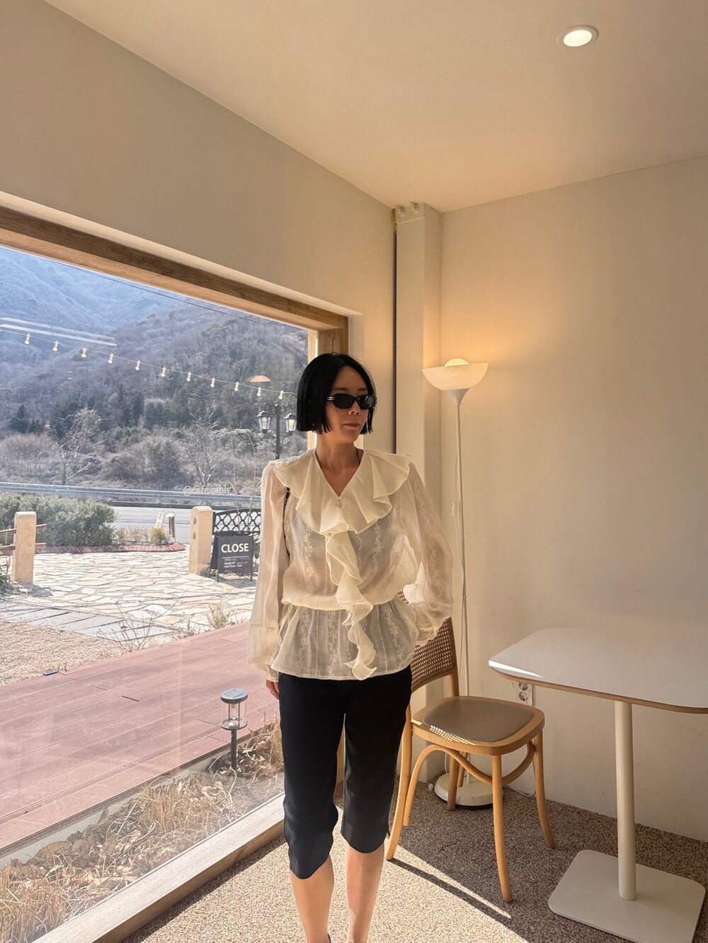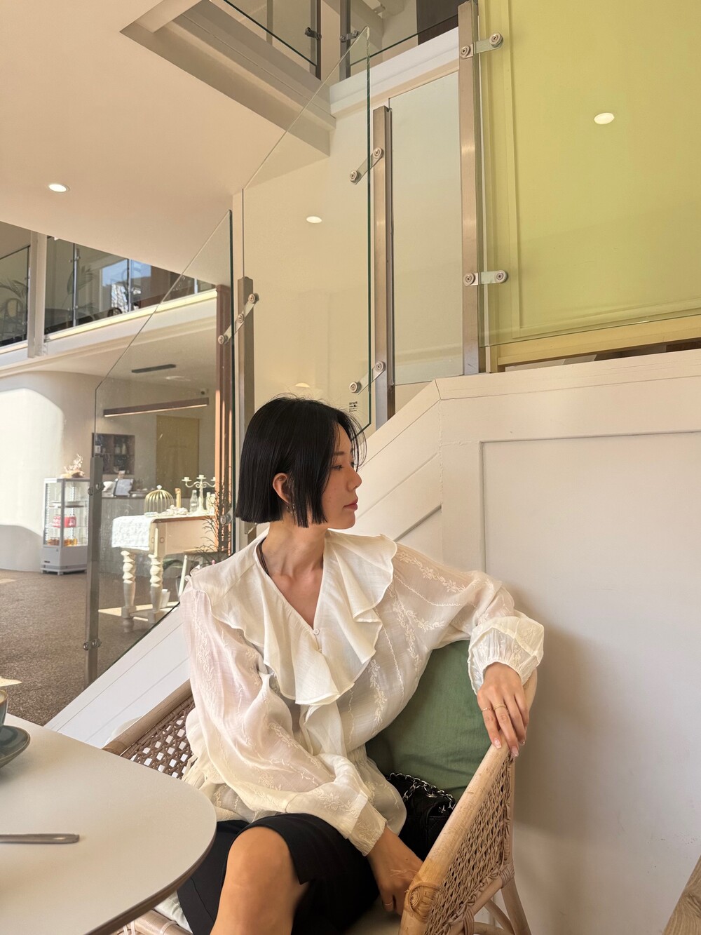 풍성한 프릴 디테일로 얼굴선을 화사하게 살려주고