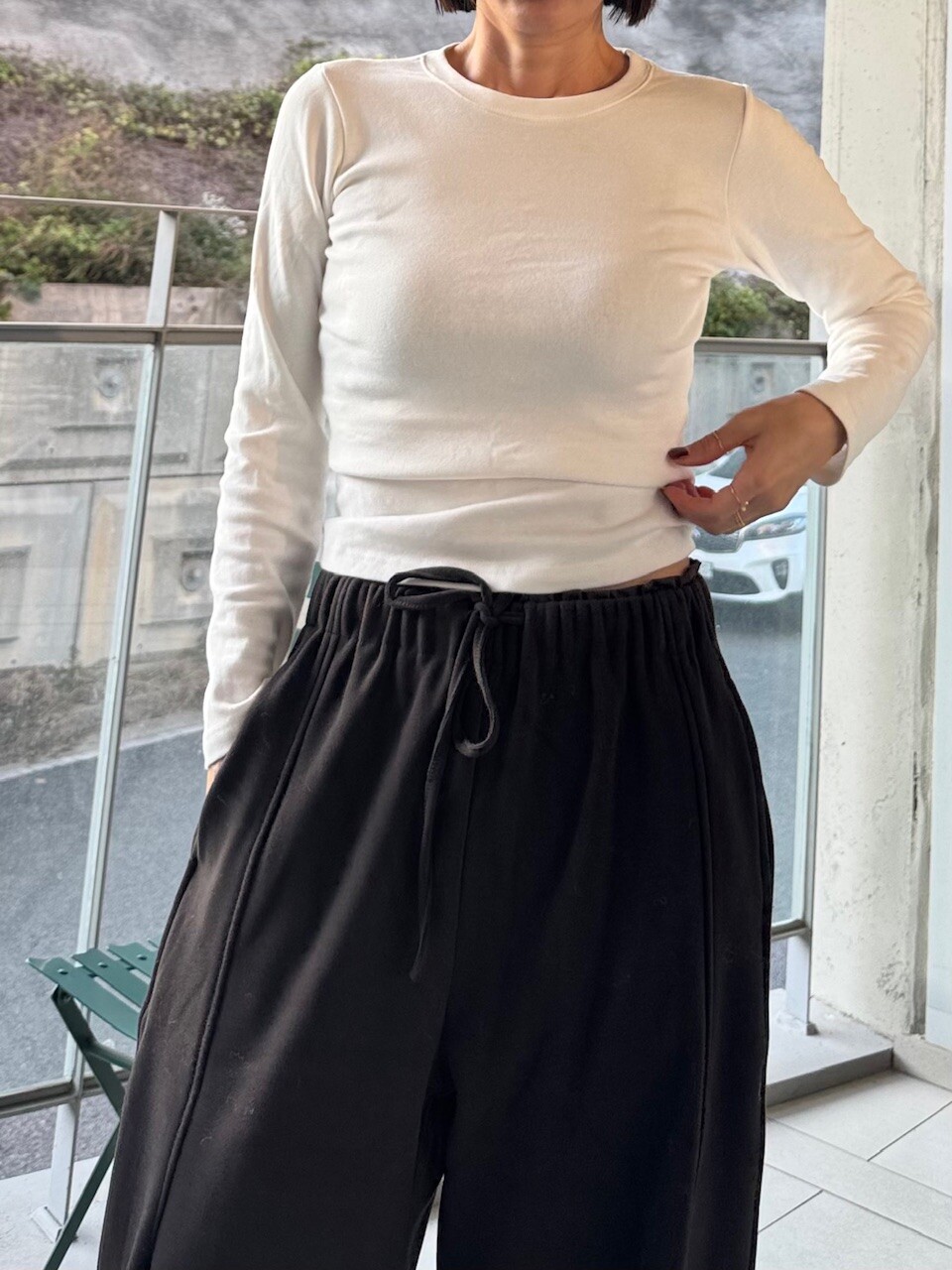 와이드란 핏감으로 떨어지는 밴딩팬츠예요