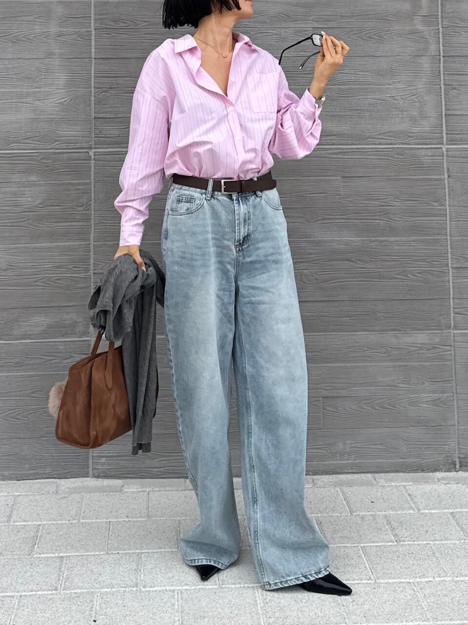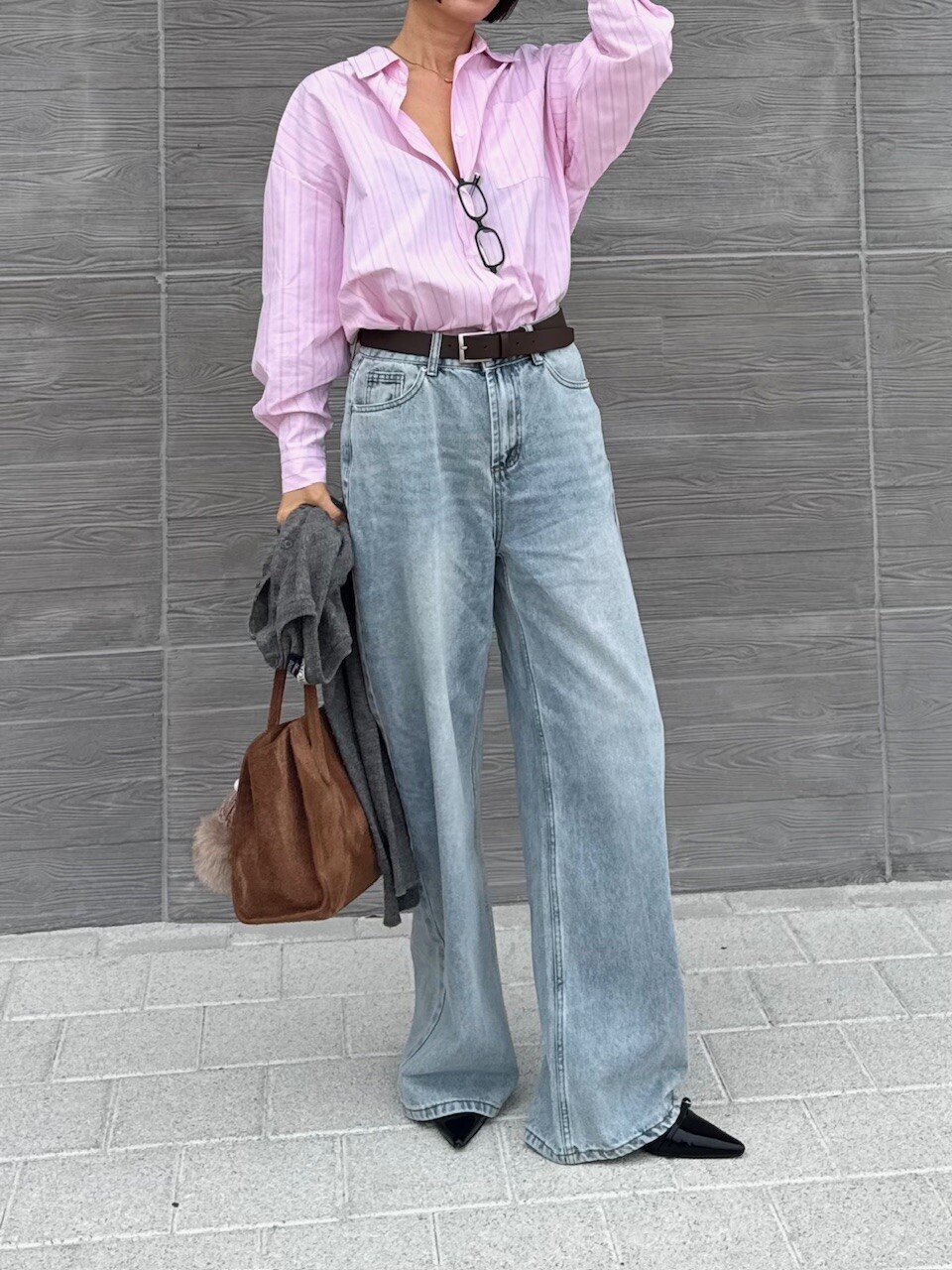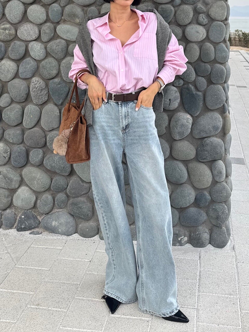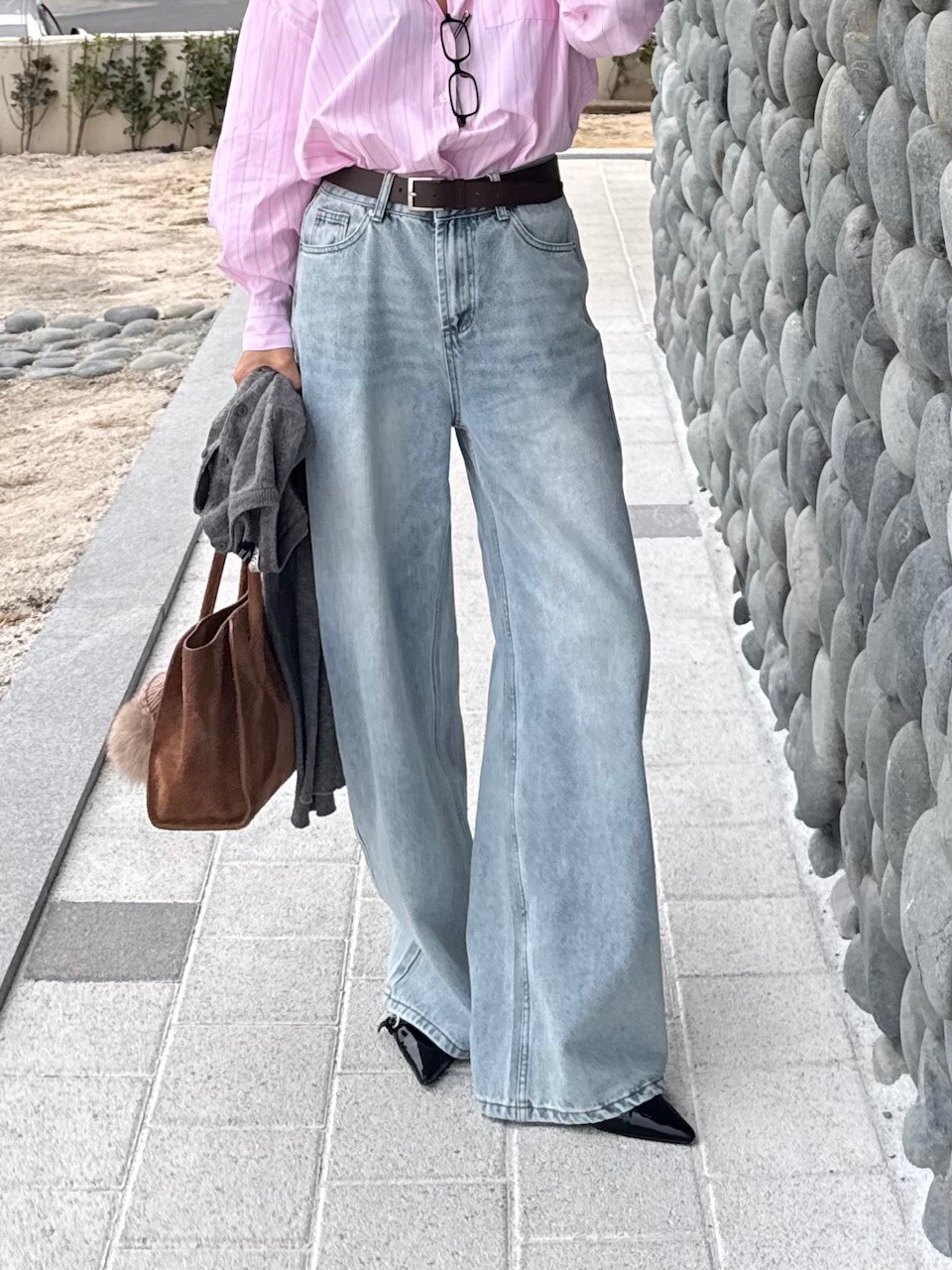워싱이 매력적인 내추럴한 느낌의 연청 와이드팬츠