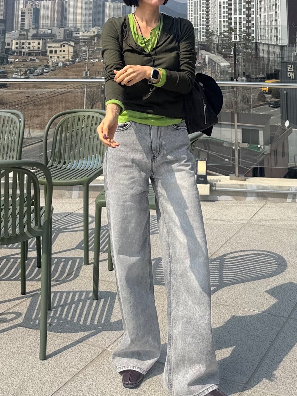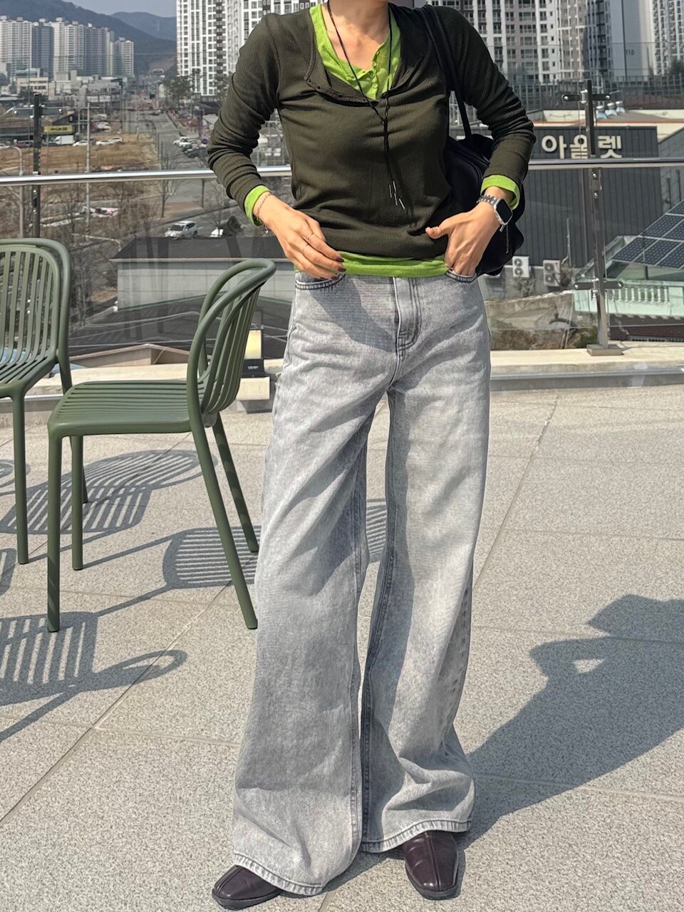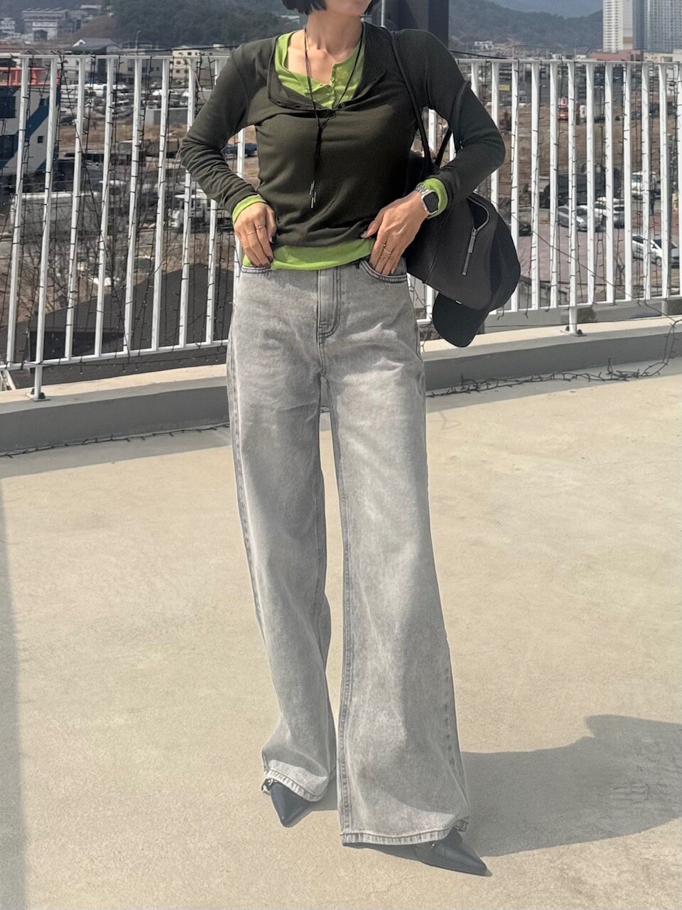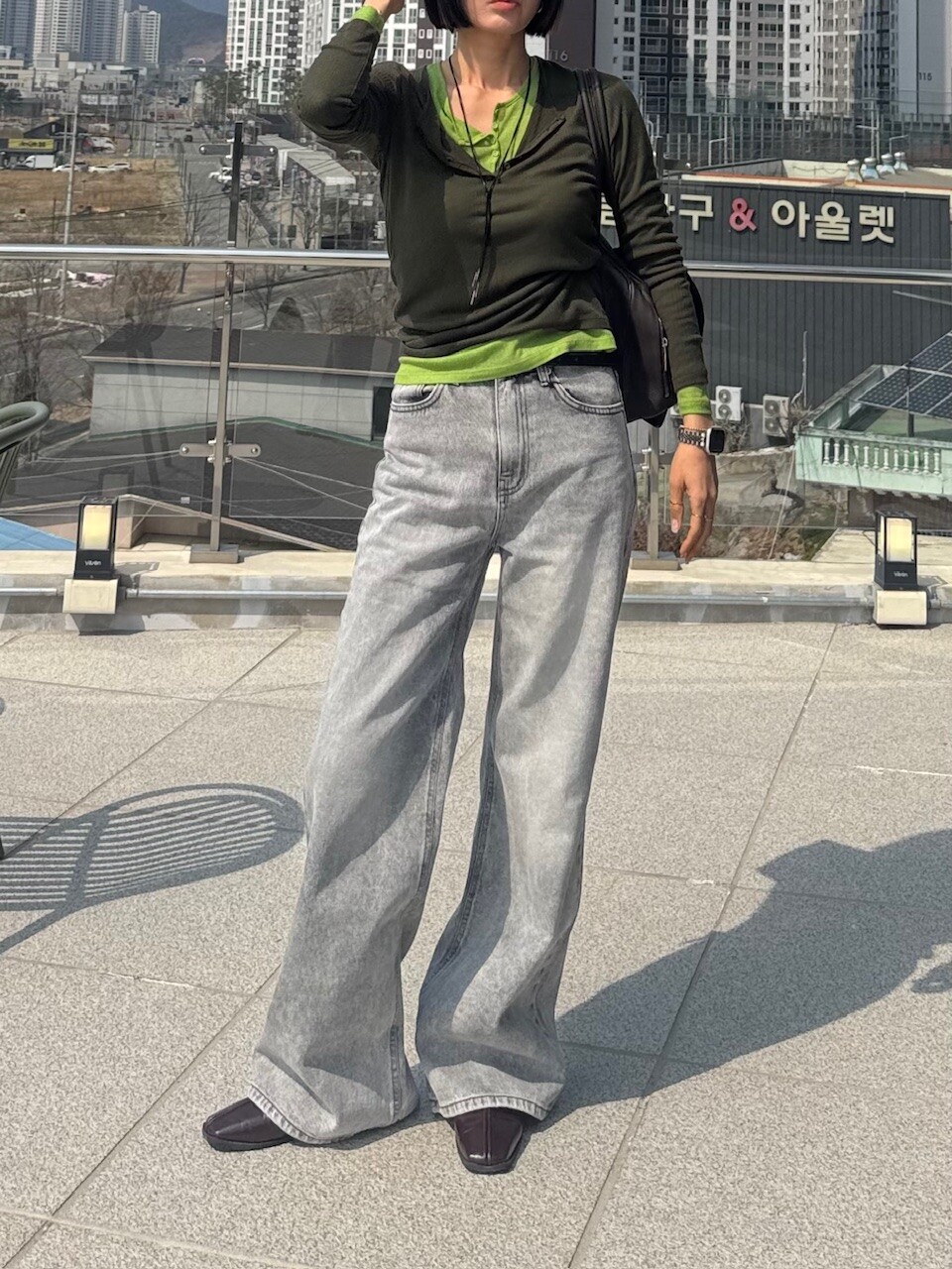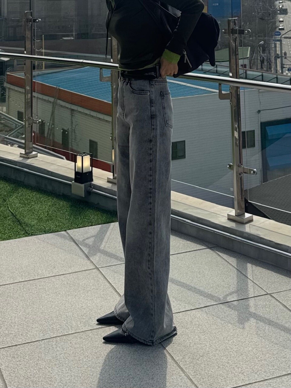 와이드핏의 그레이 데님 팬츠