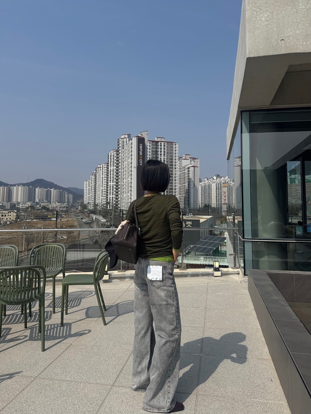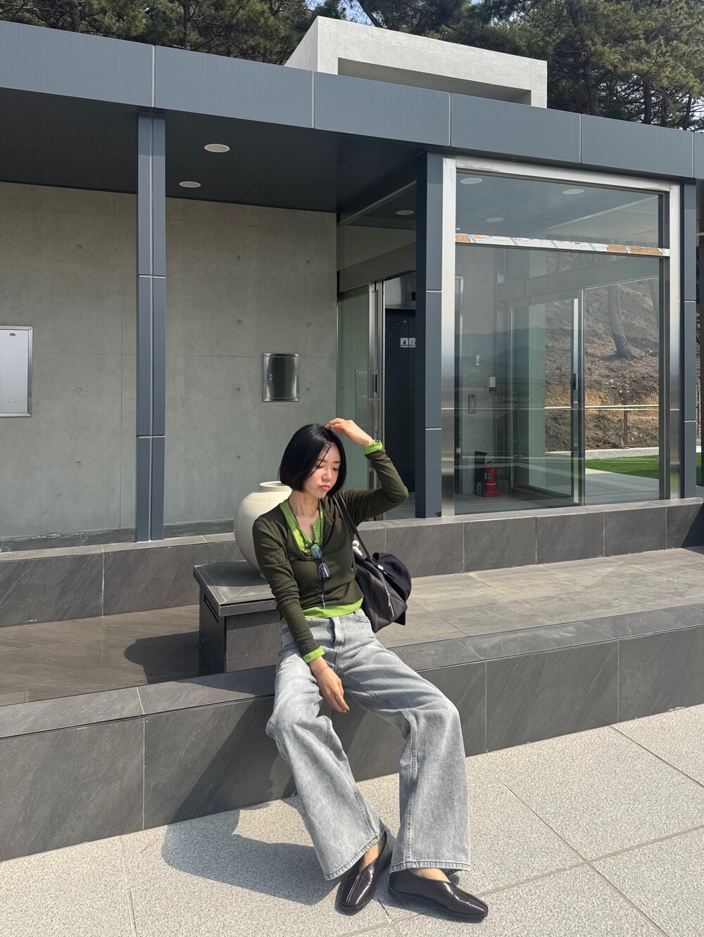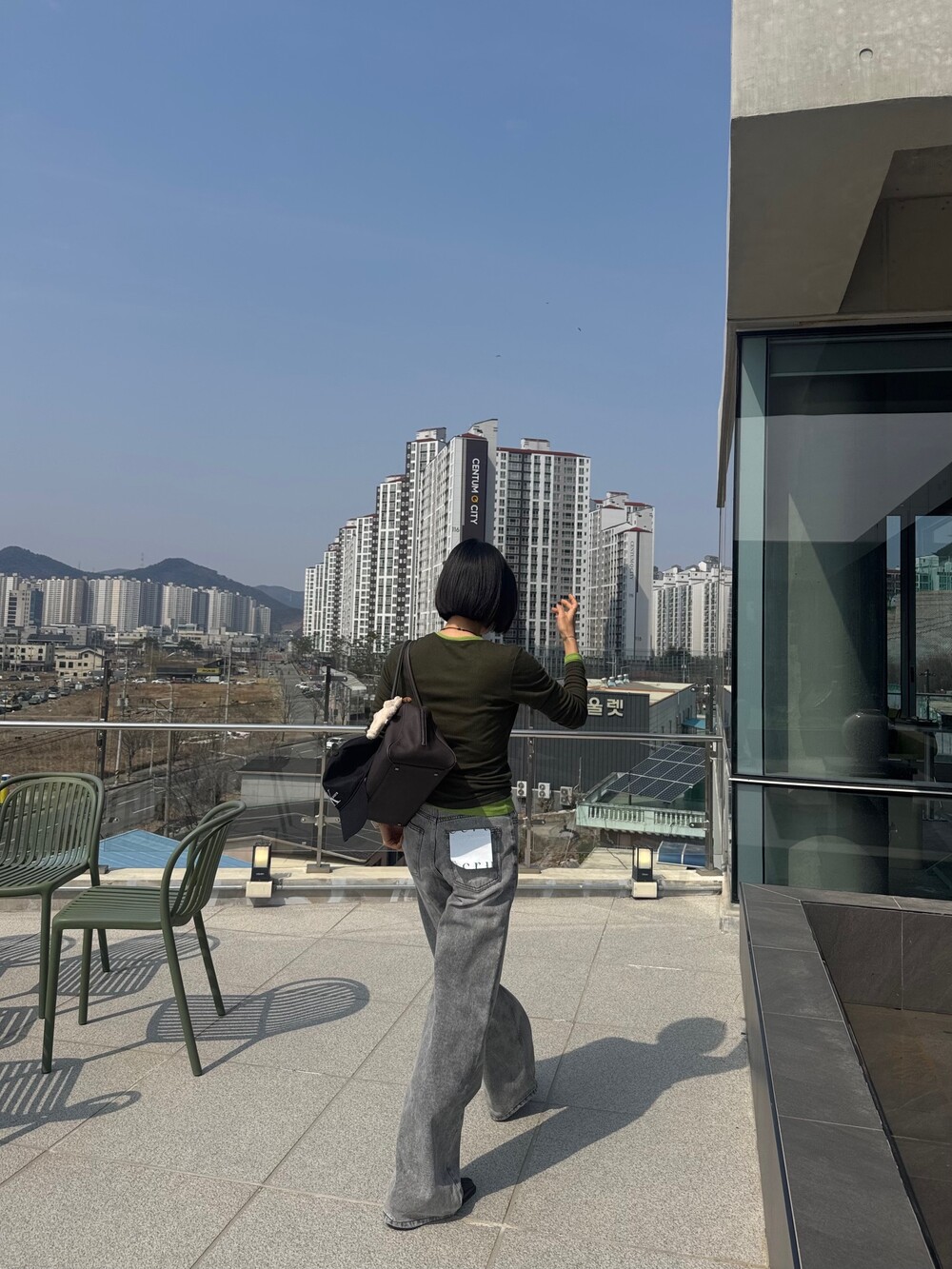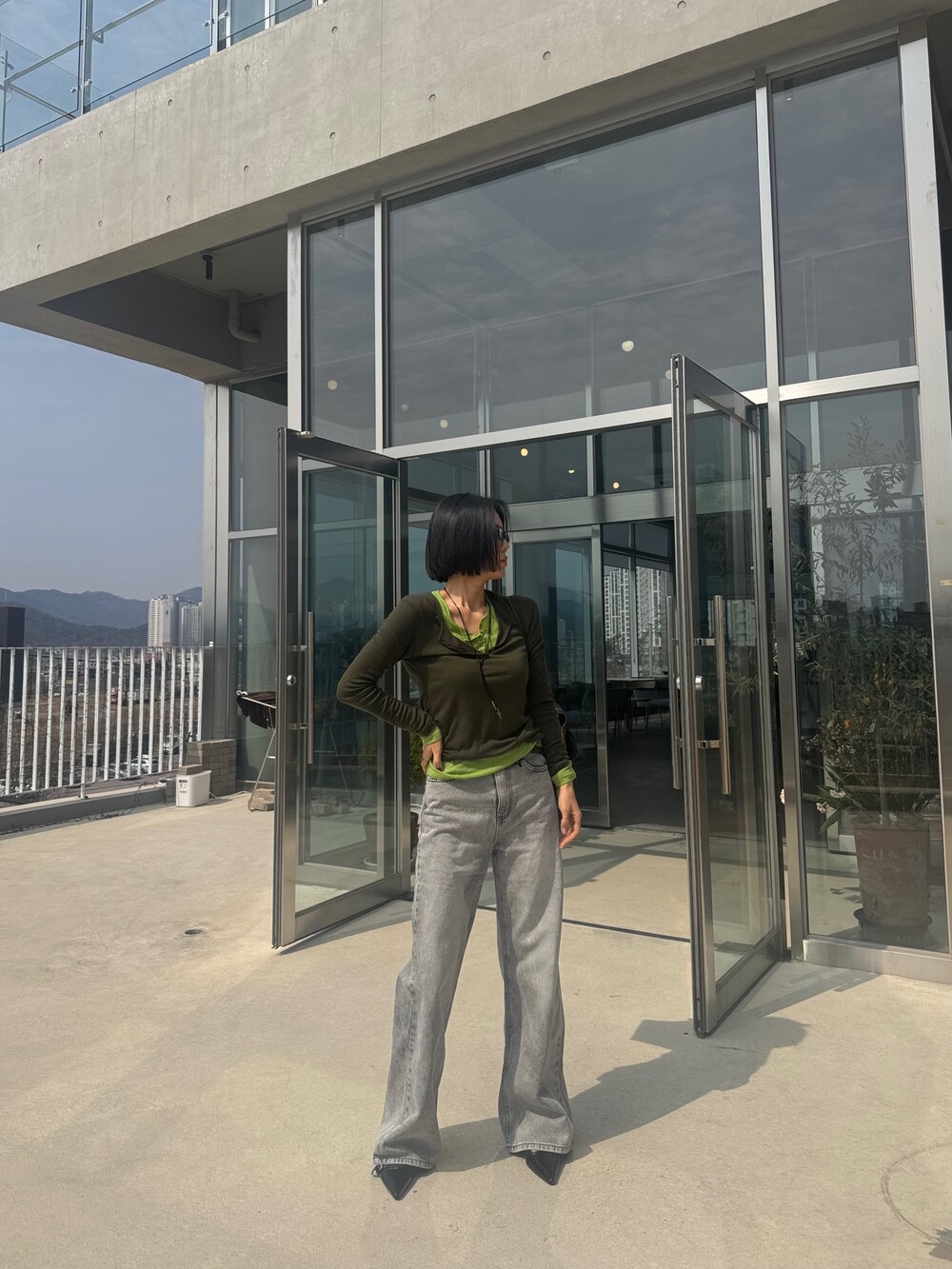 와이드핏의 그레이 데님 팬츠