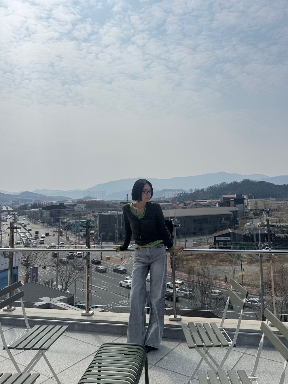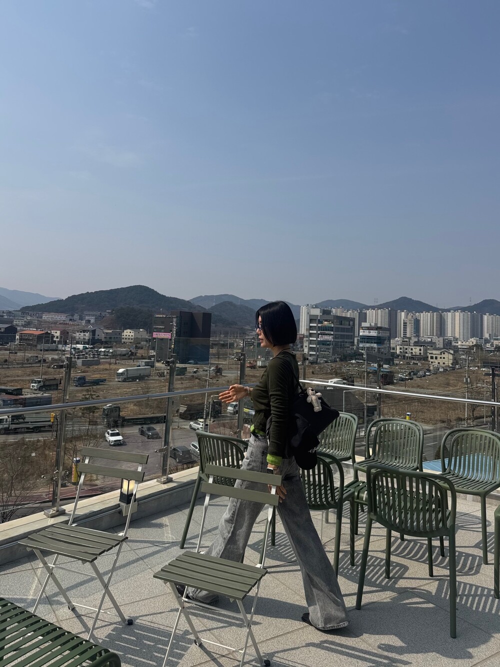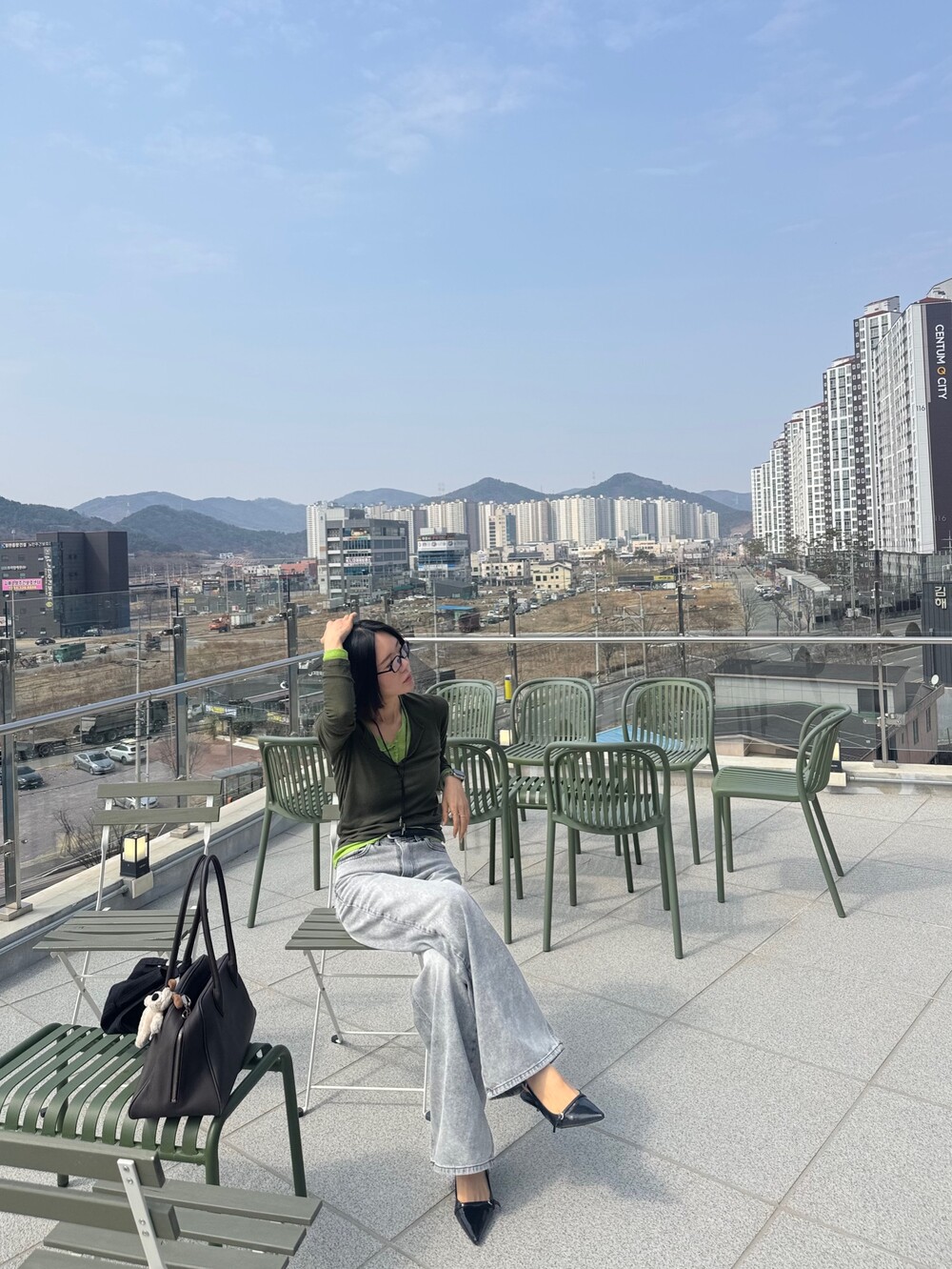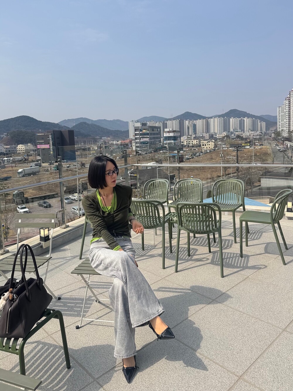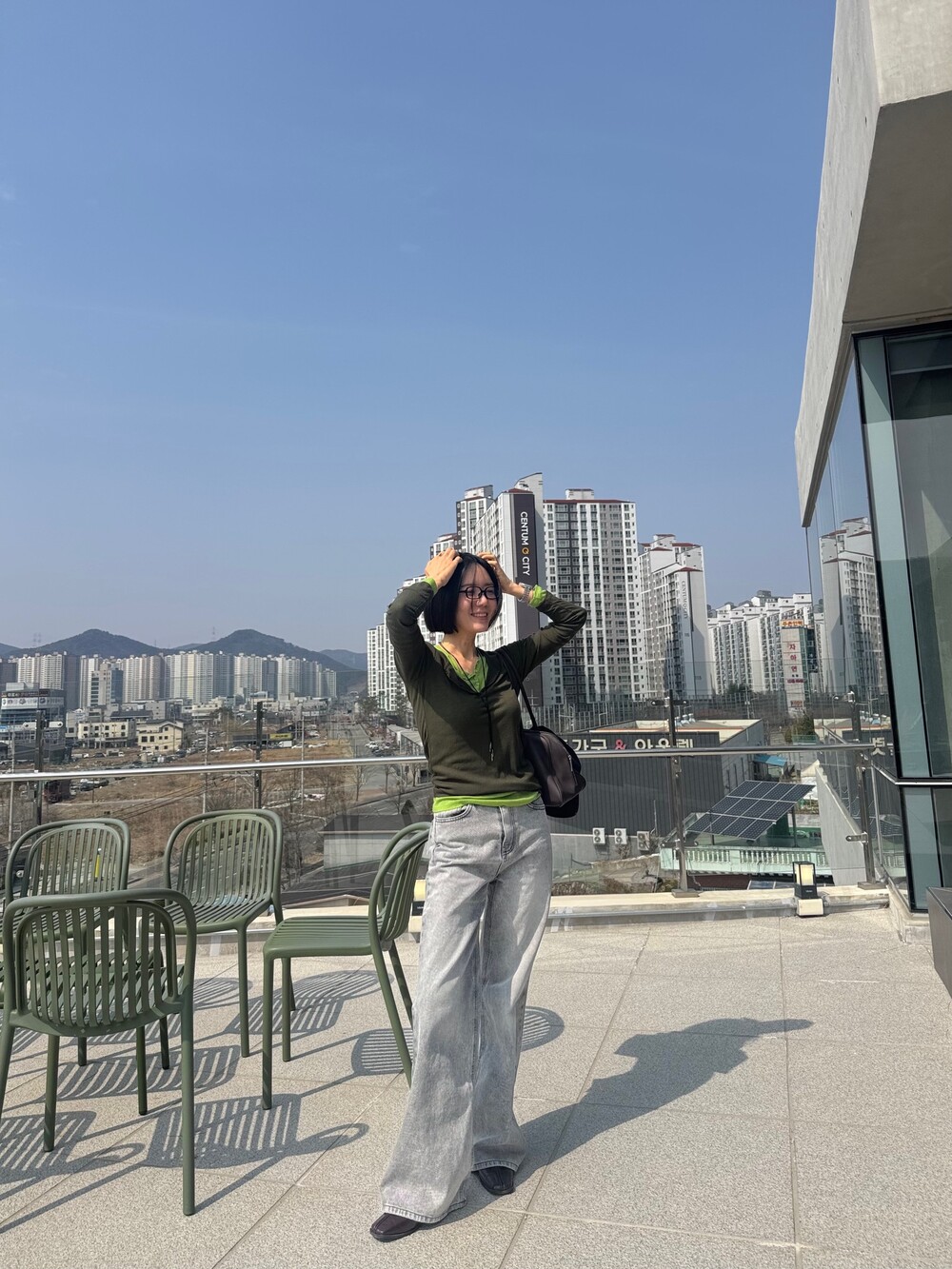 와이드핏의 그레이 데님 팬츠