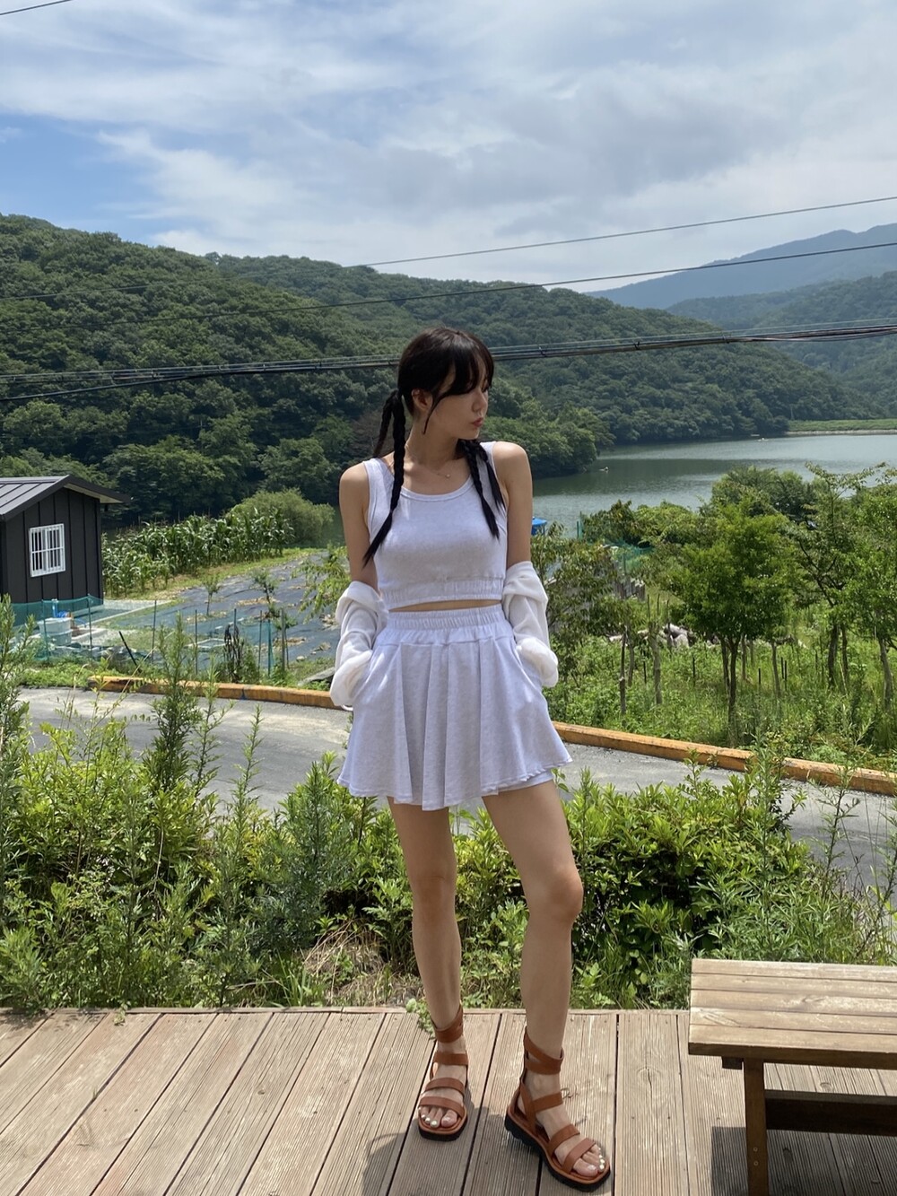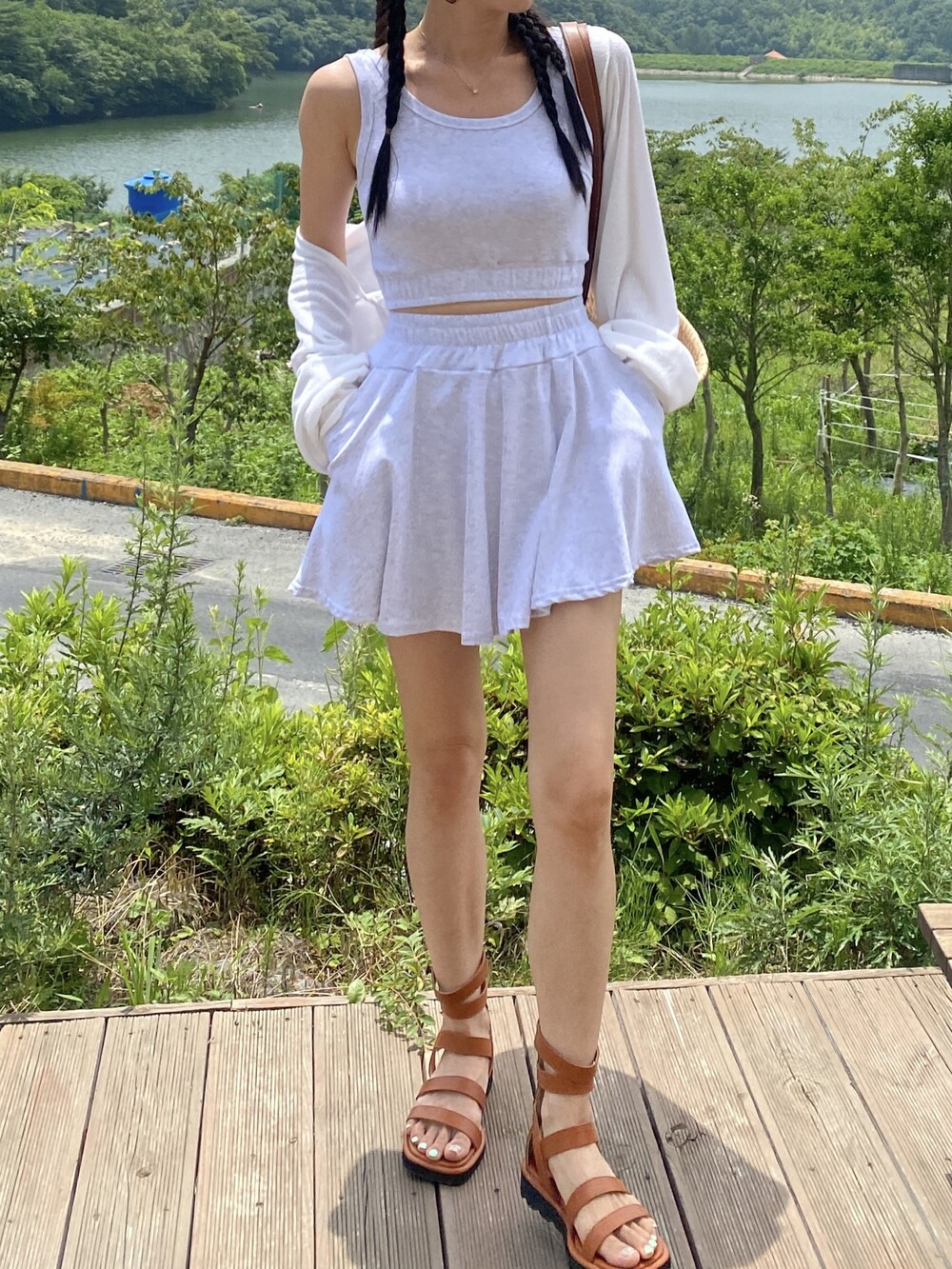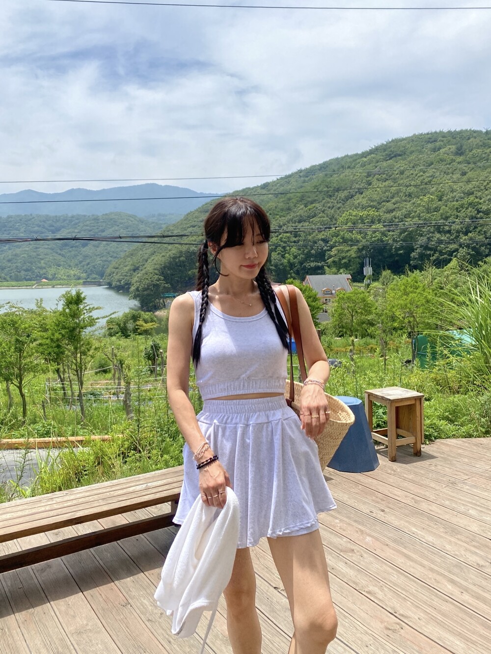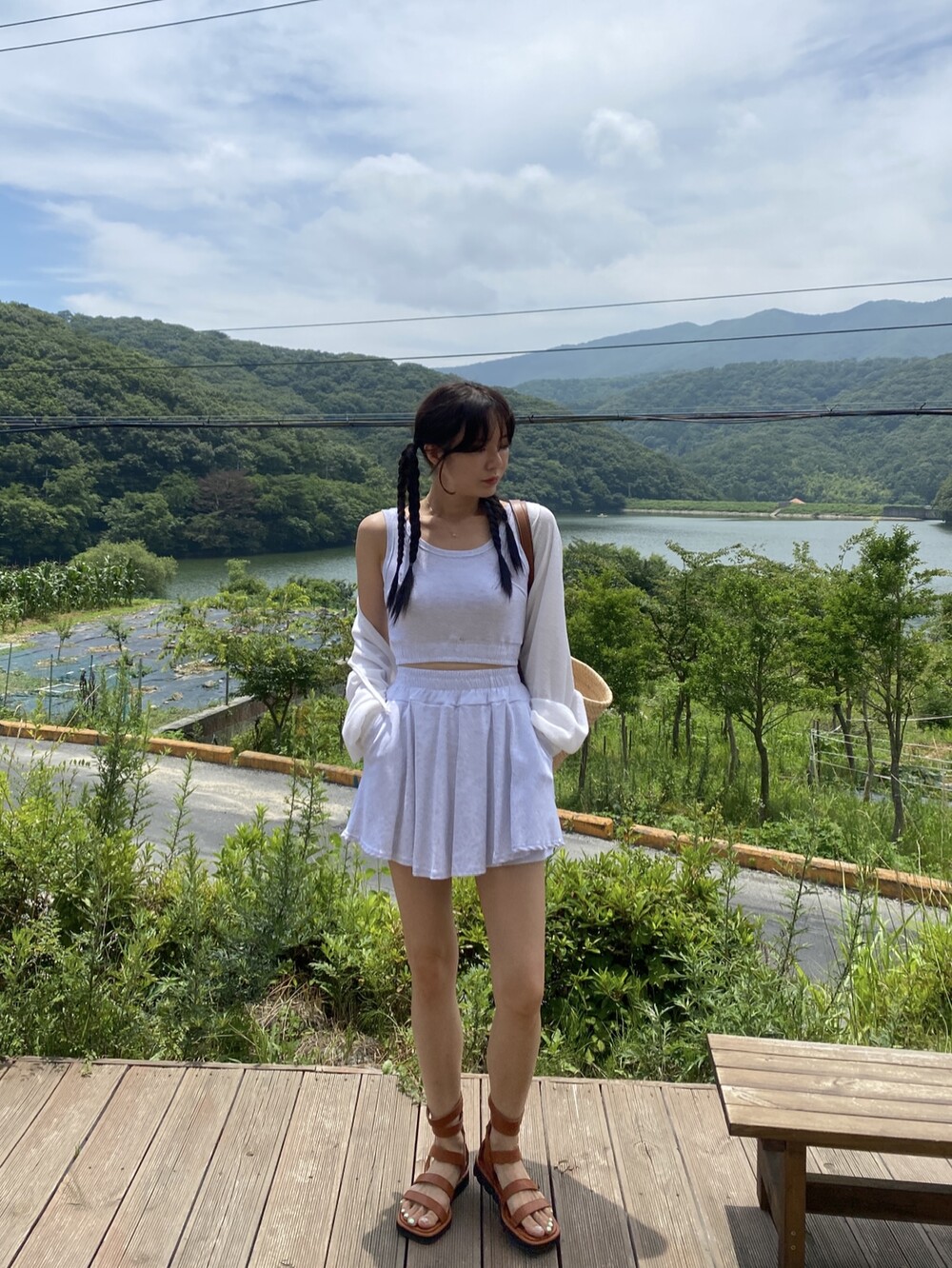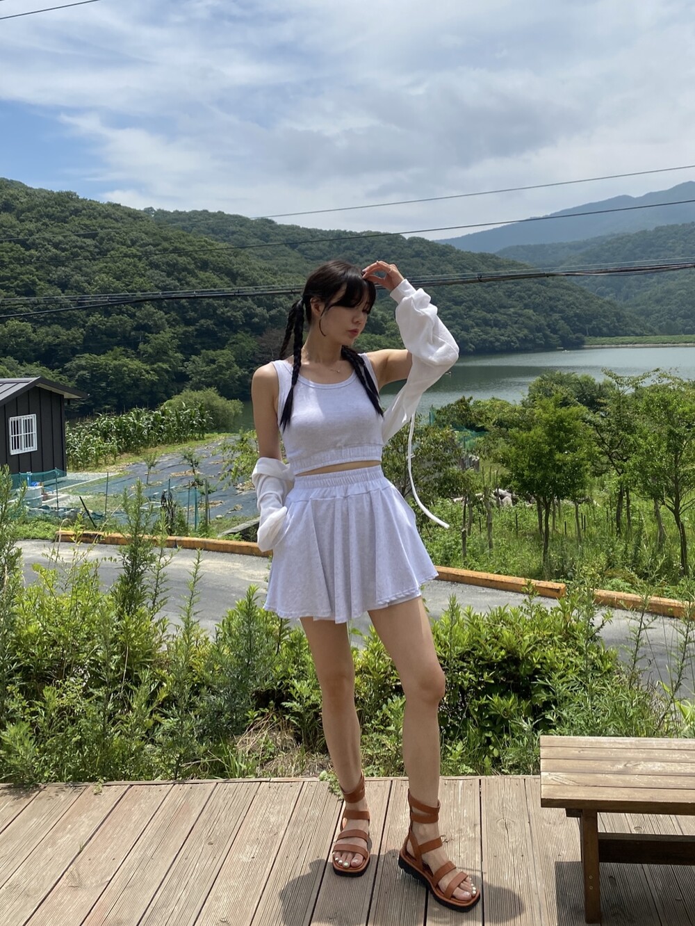 크롭기장의 나시지만 스커트가 하이로 올라오며