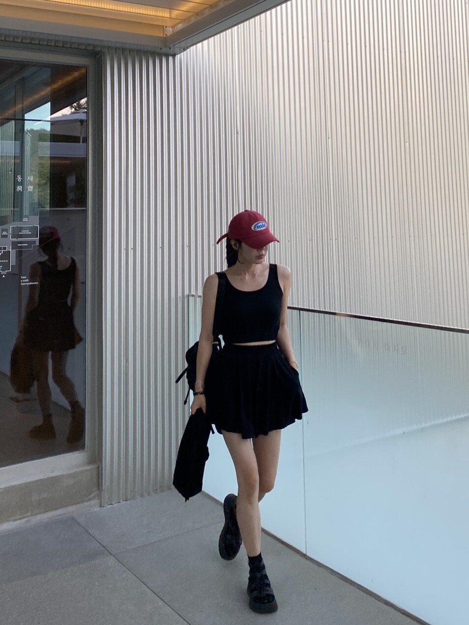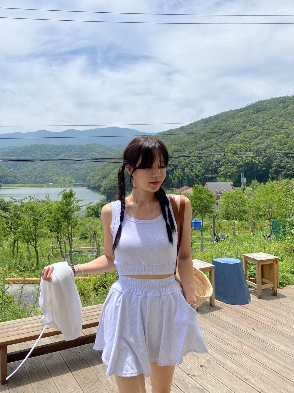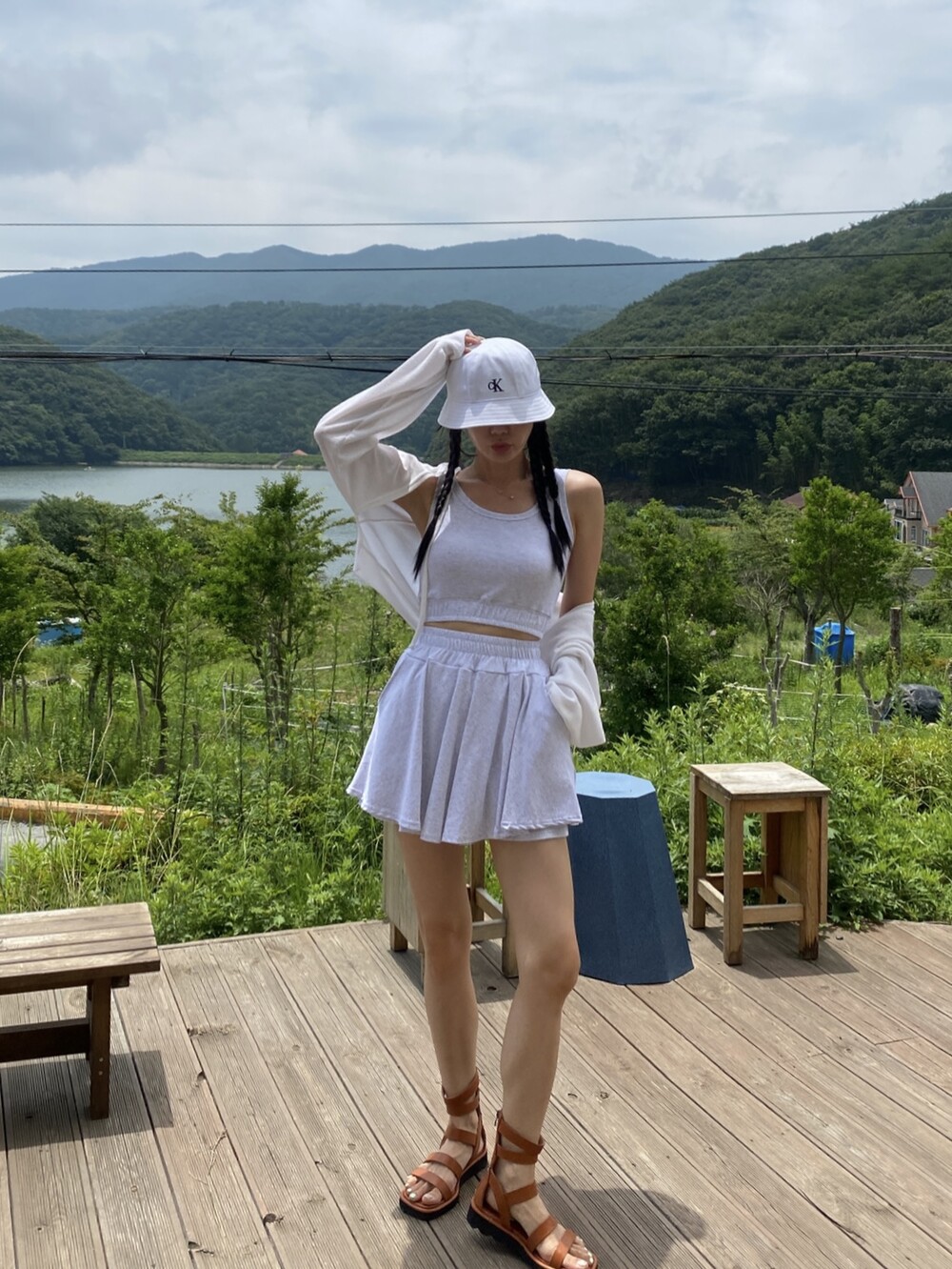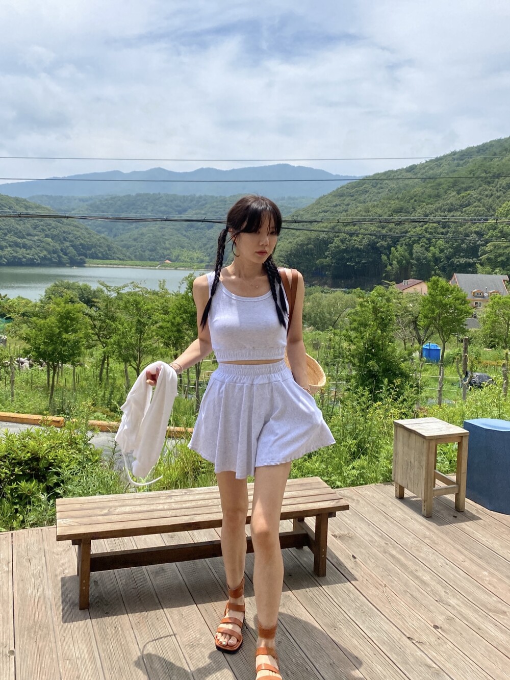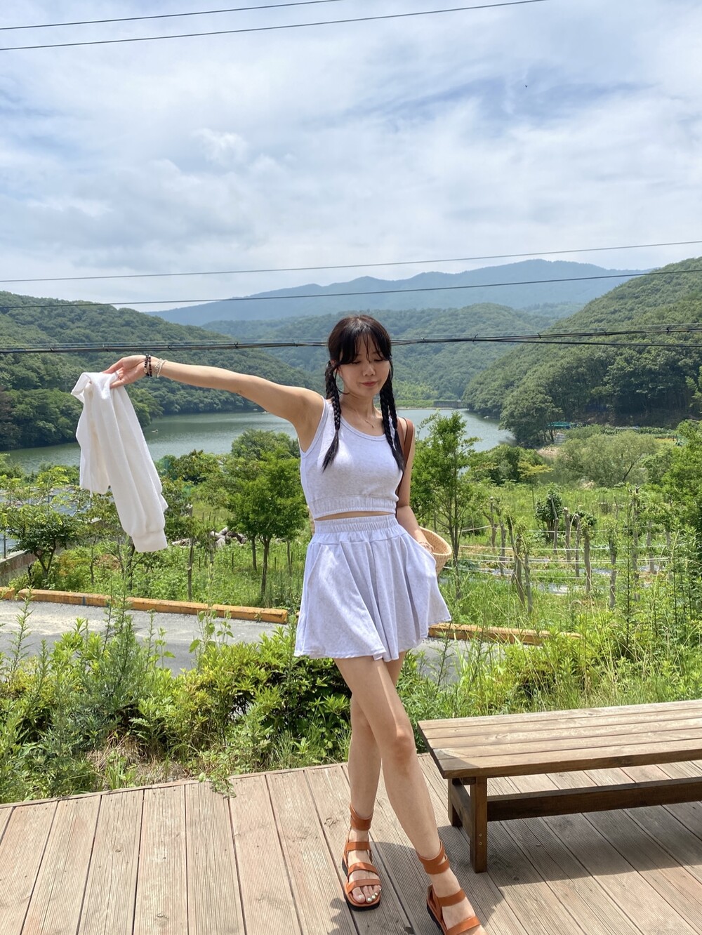크롭기장의 나시지만 스커트가 하이로 올라오며