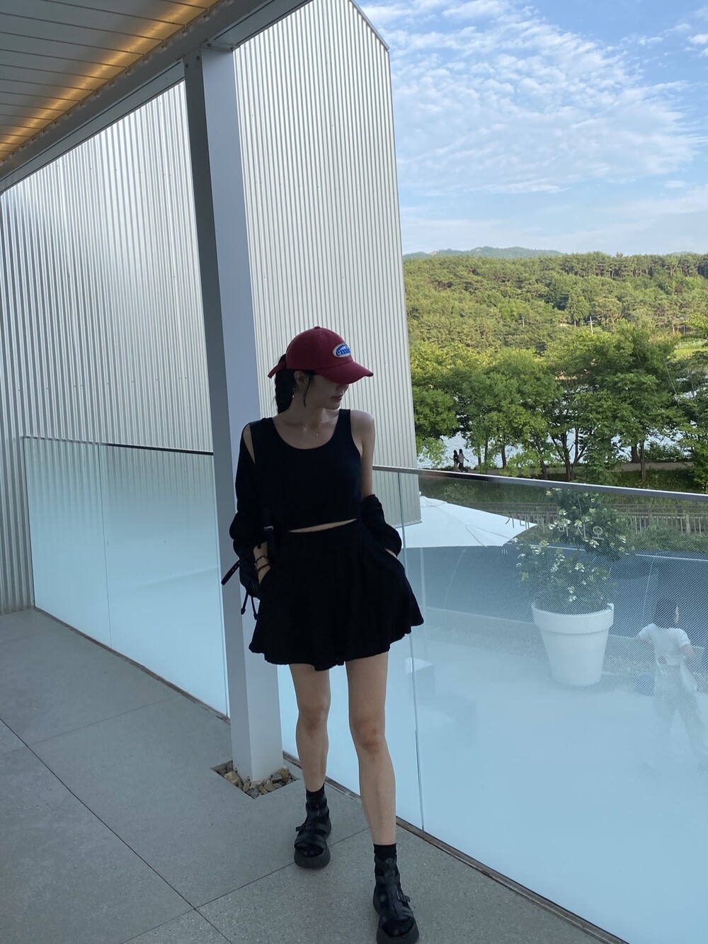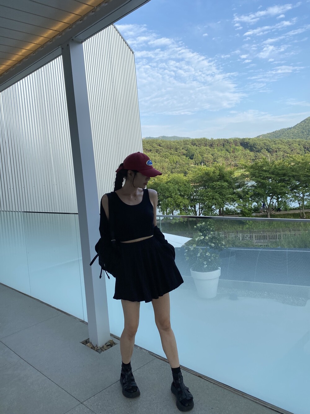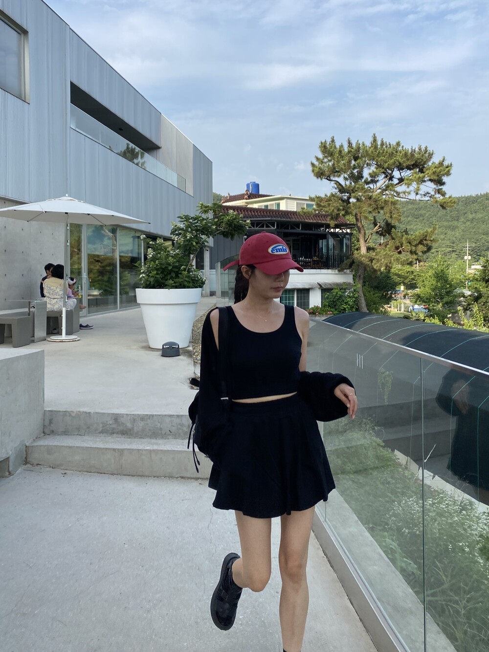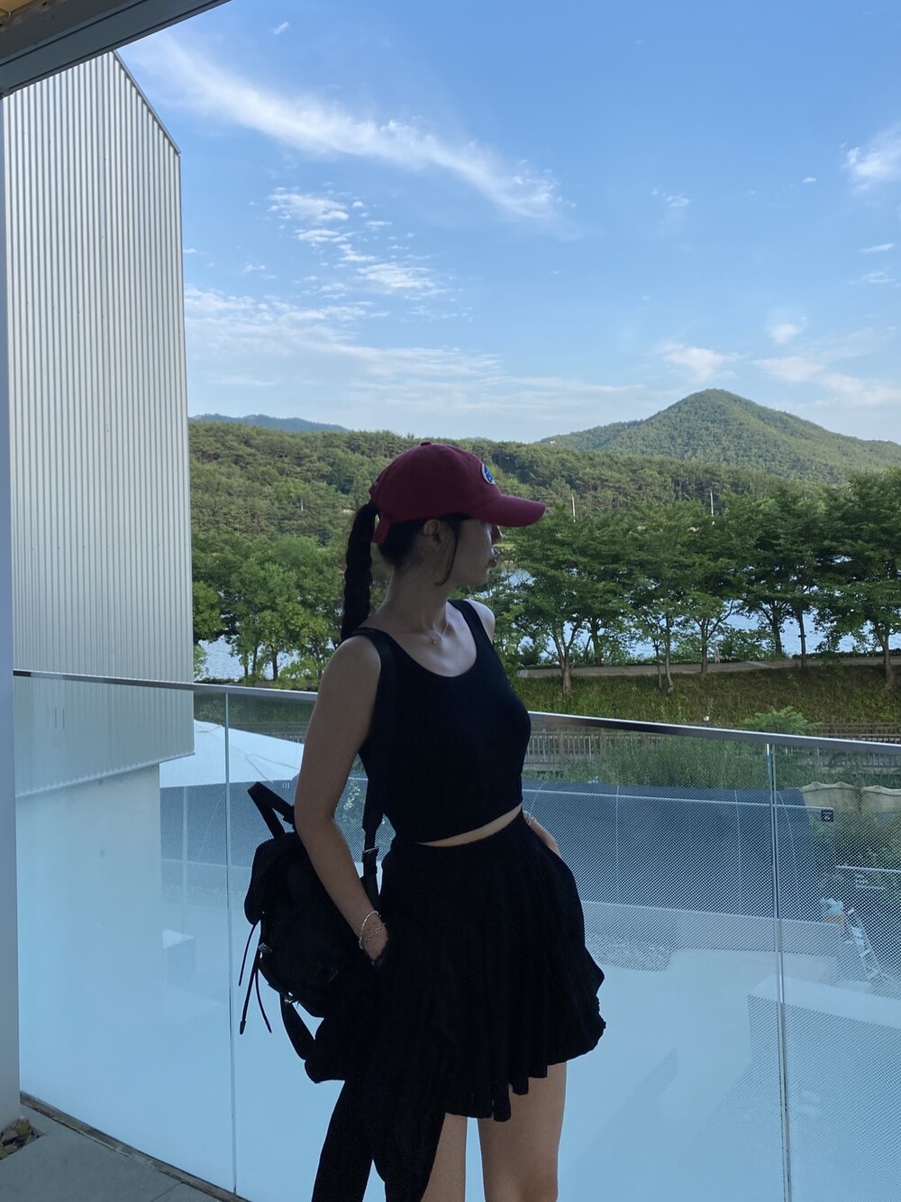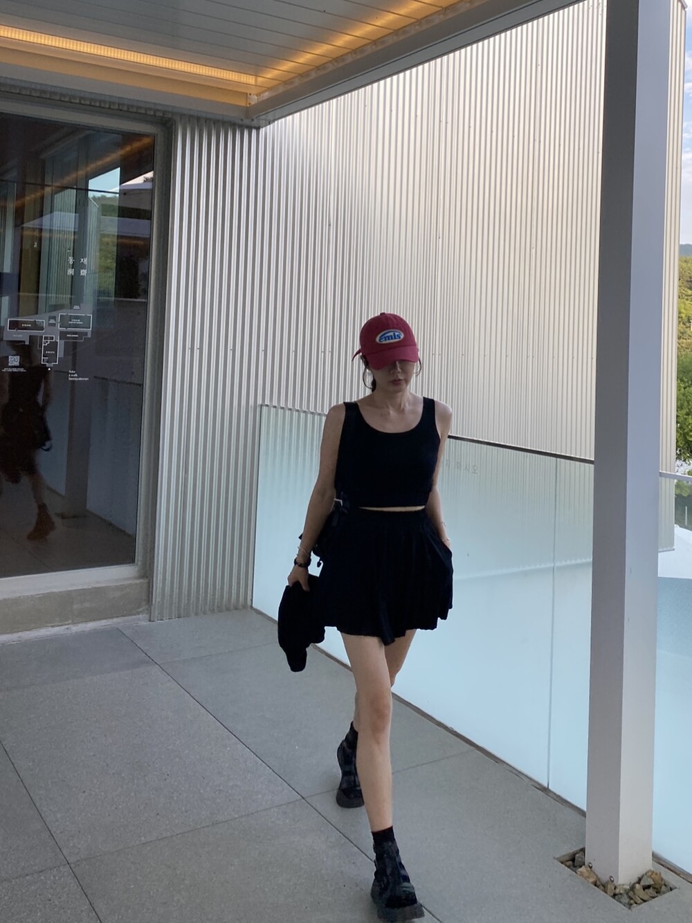 크롭기장의 나시지만 스커트가 하이로 올라오며