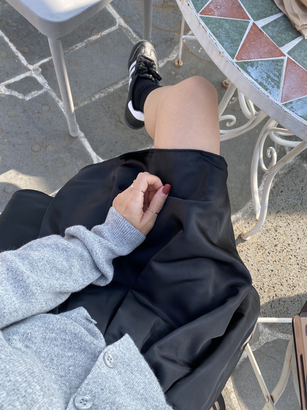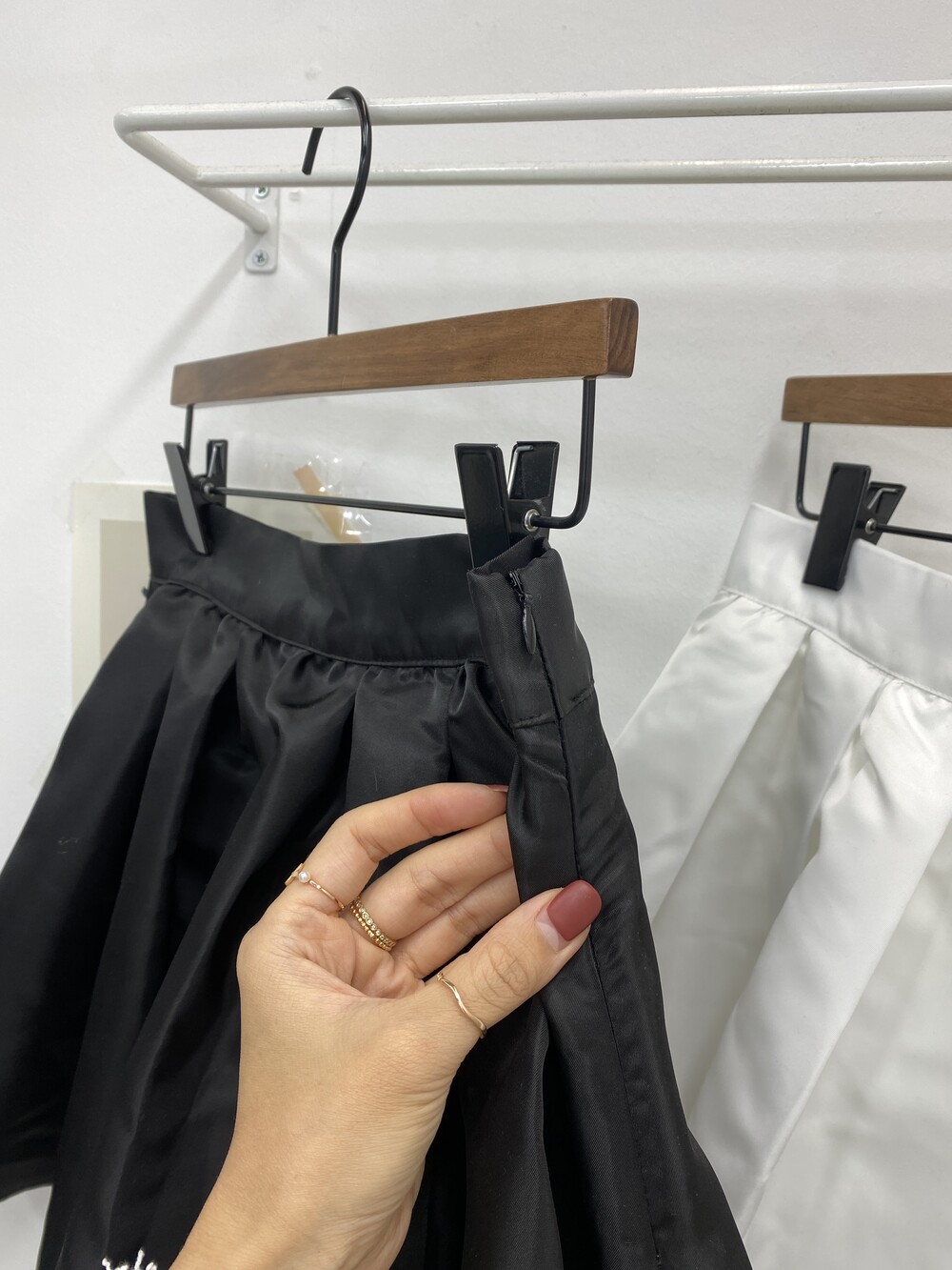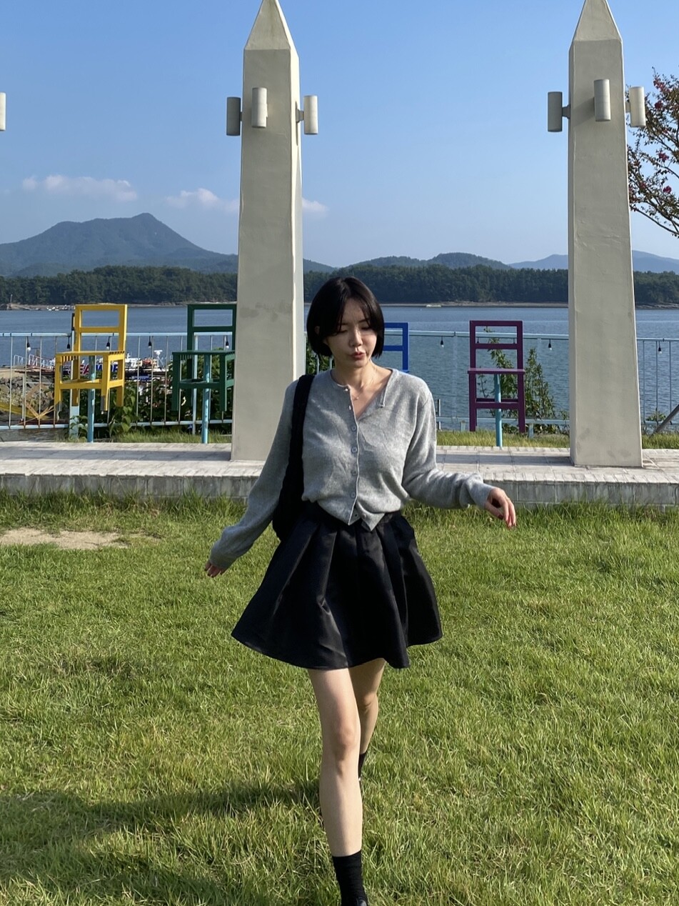 밑단 플레어 라인의 멋스러운 뒷밴딩 스커트예요