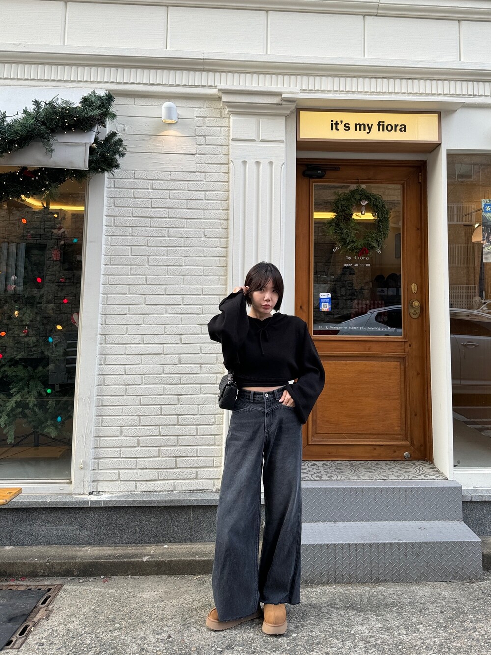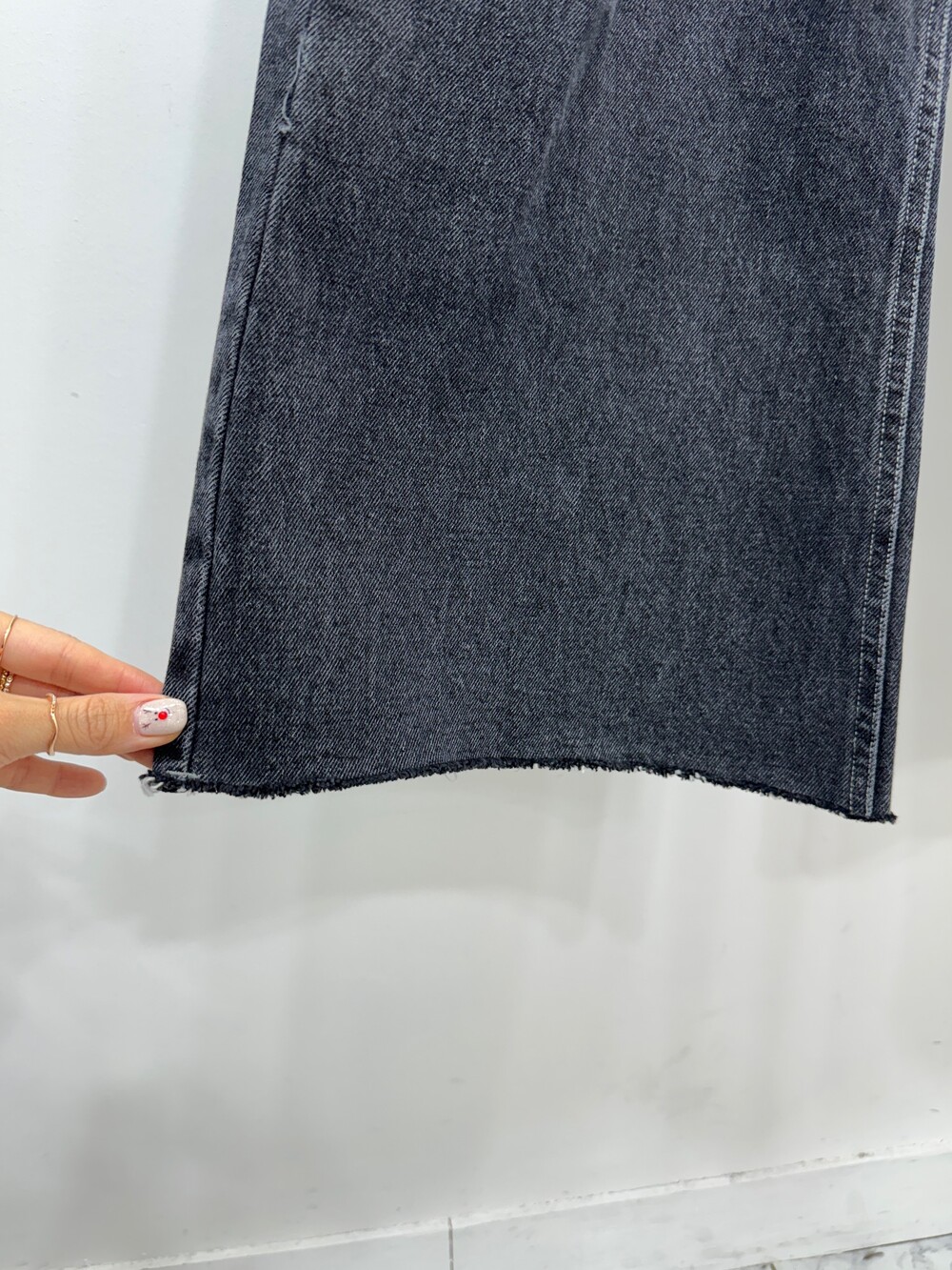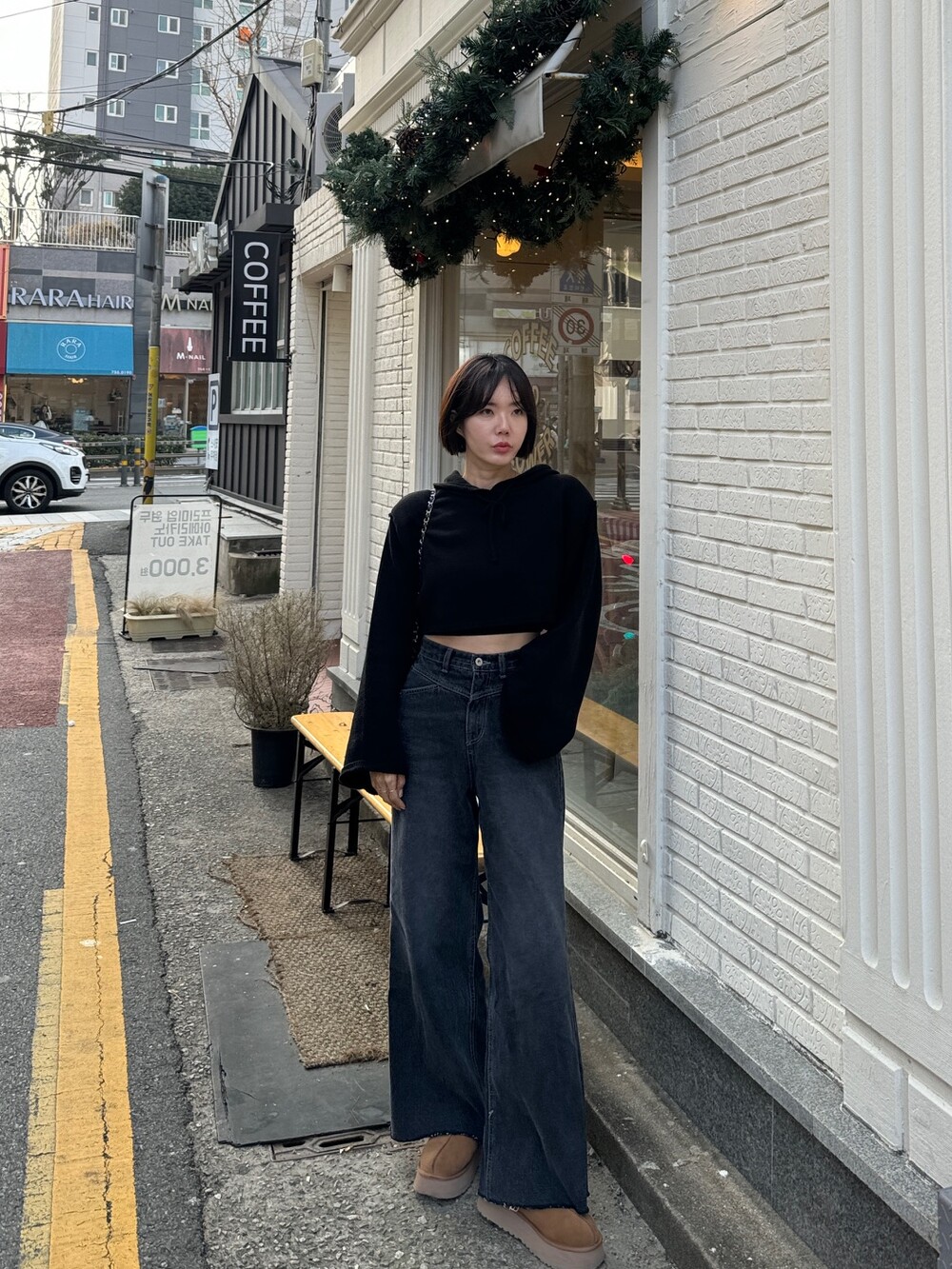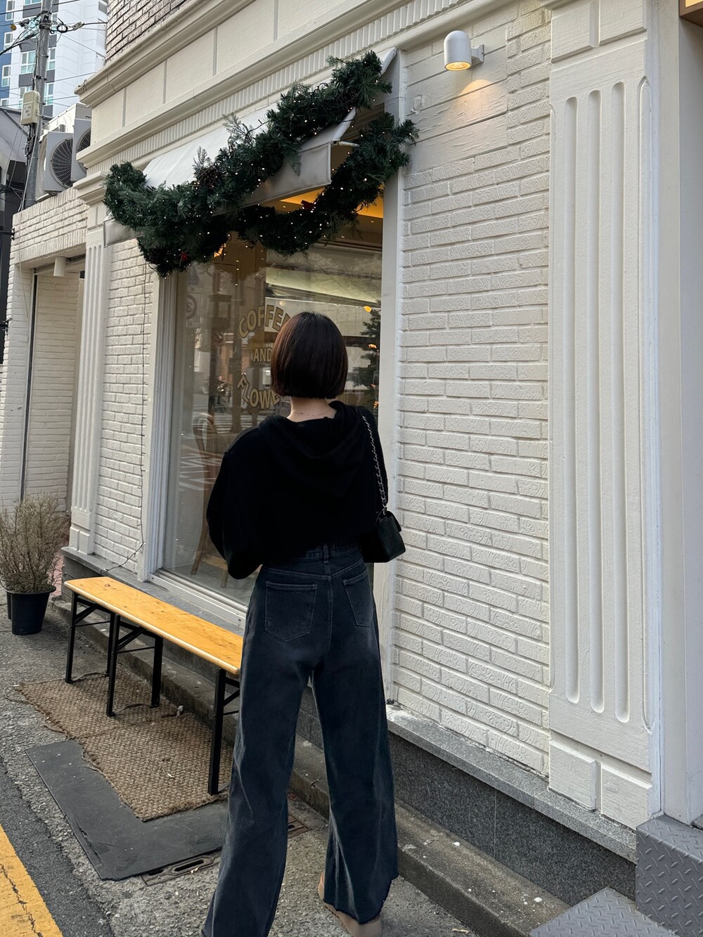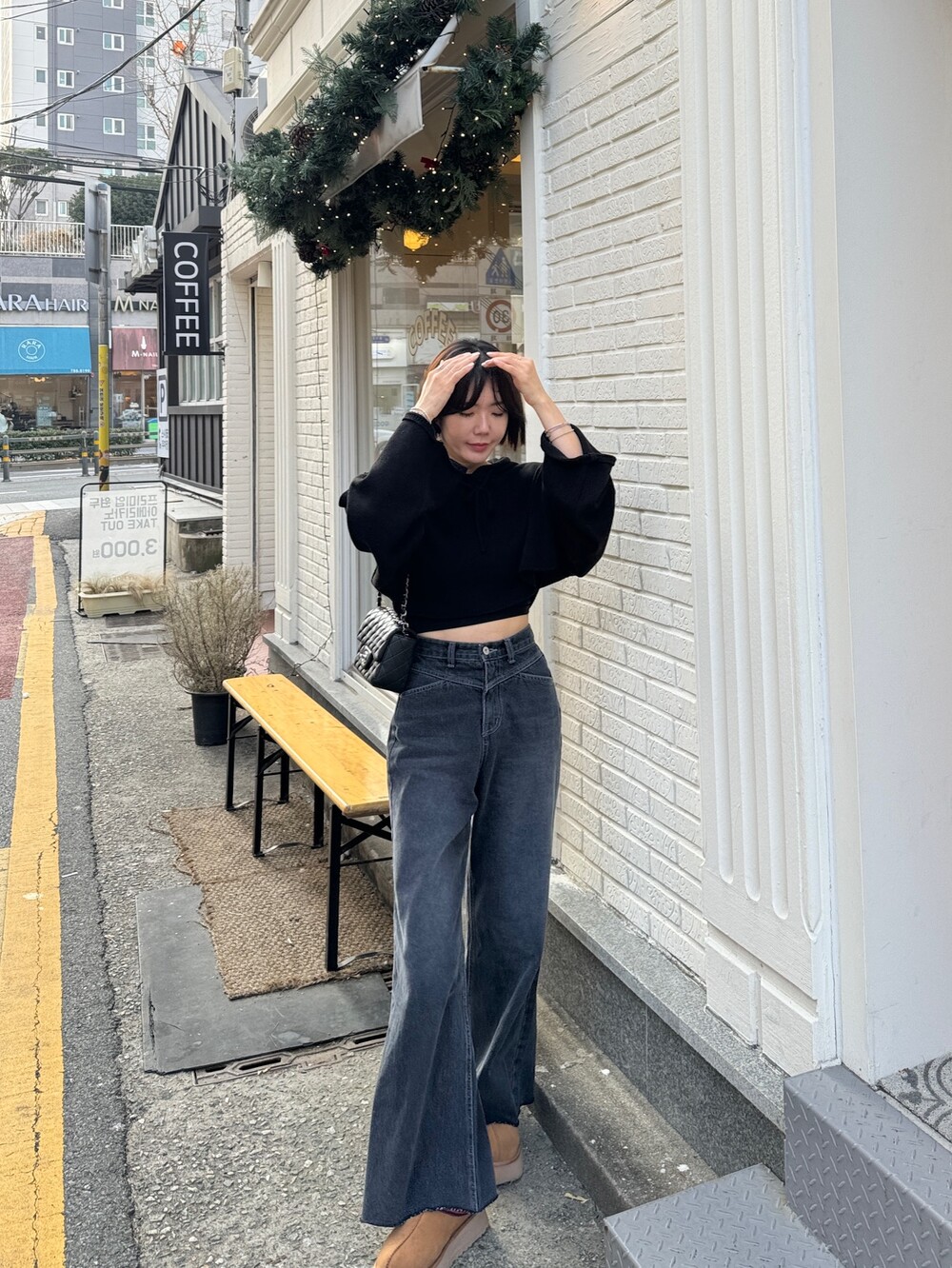 밑단 컷팅으로 핏감 좋은 와이드 데님 팬츠