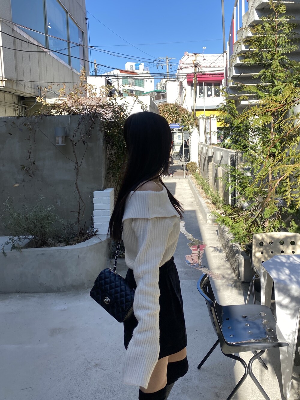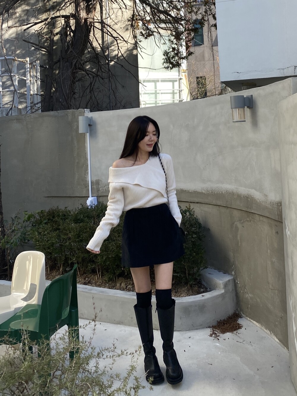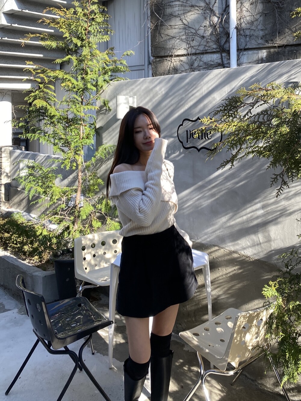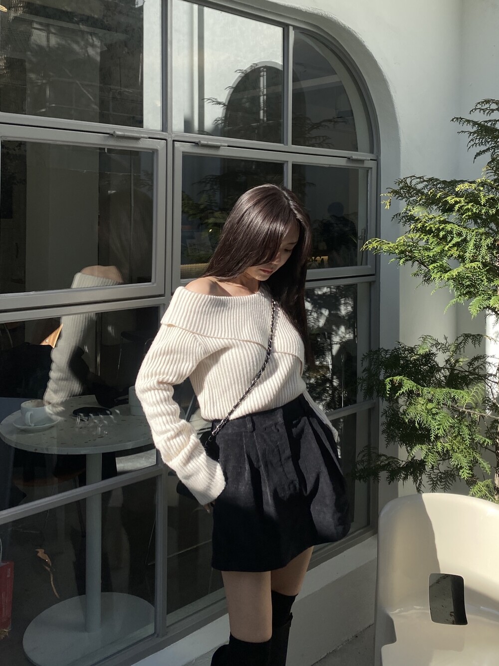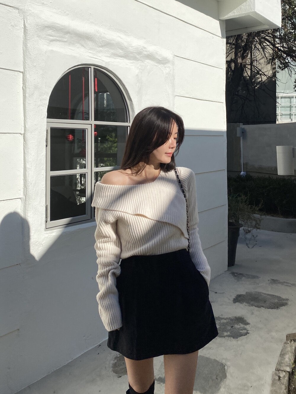 어깨라인을 드러내주는 언발 스타일의 오프숄더 넥의