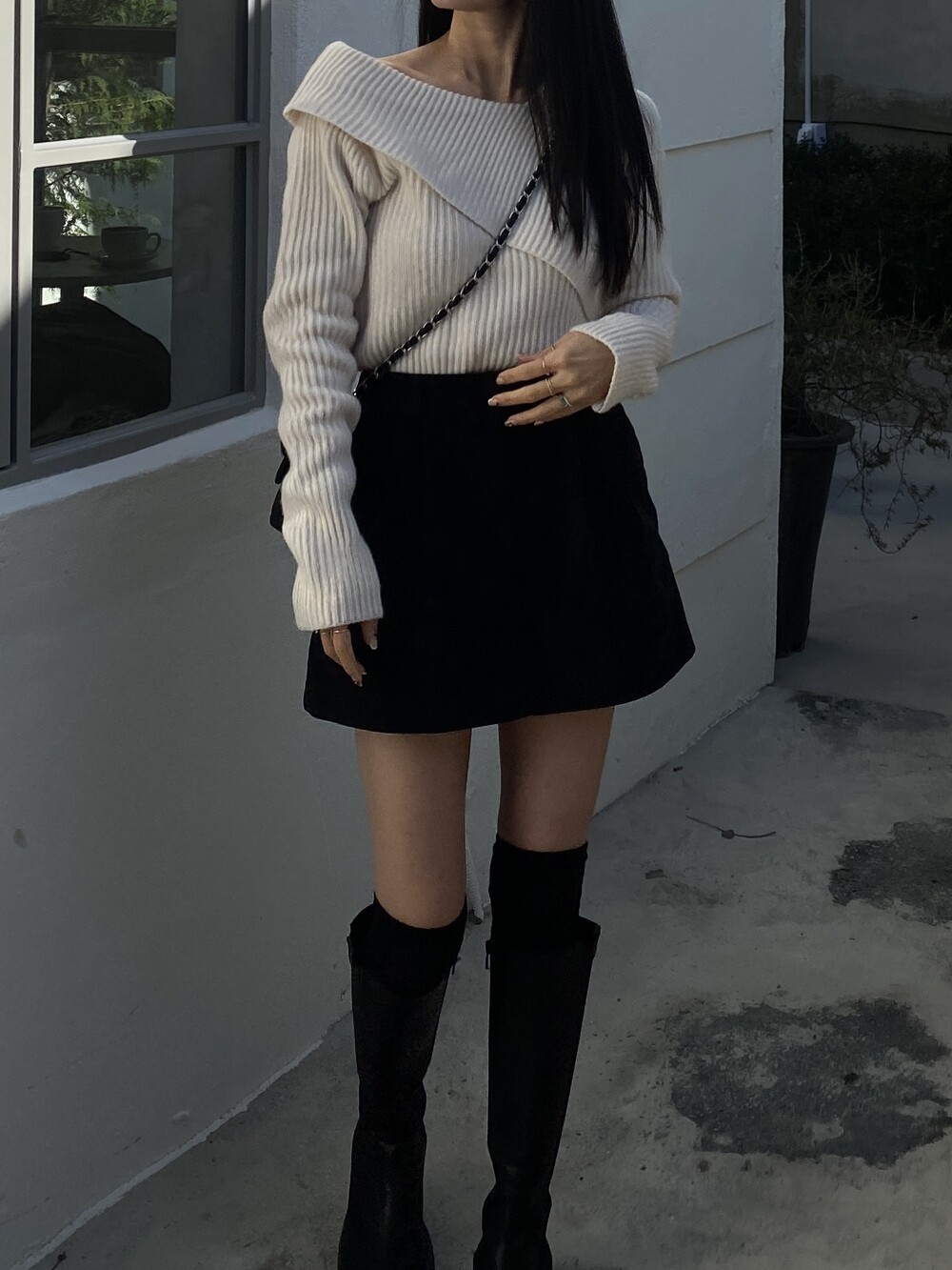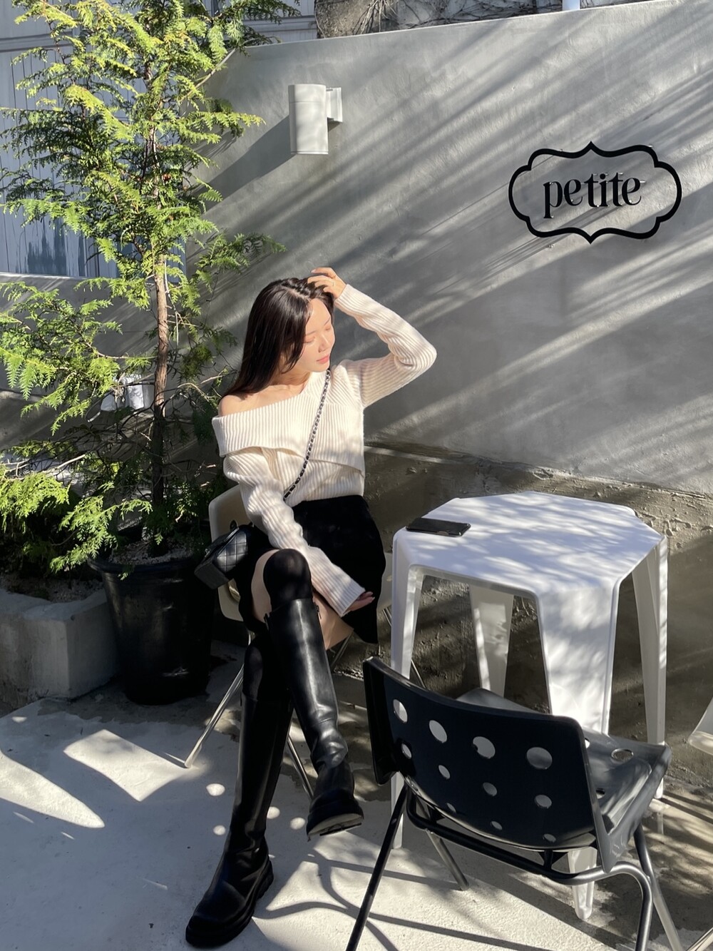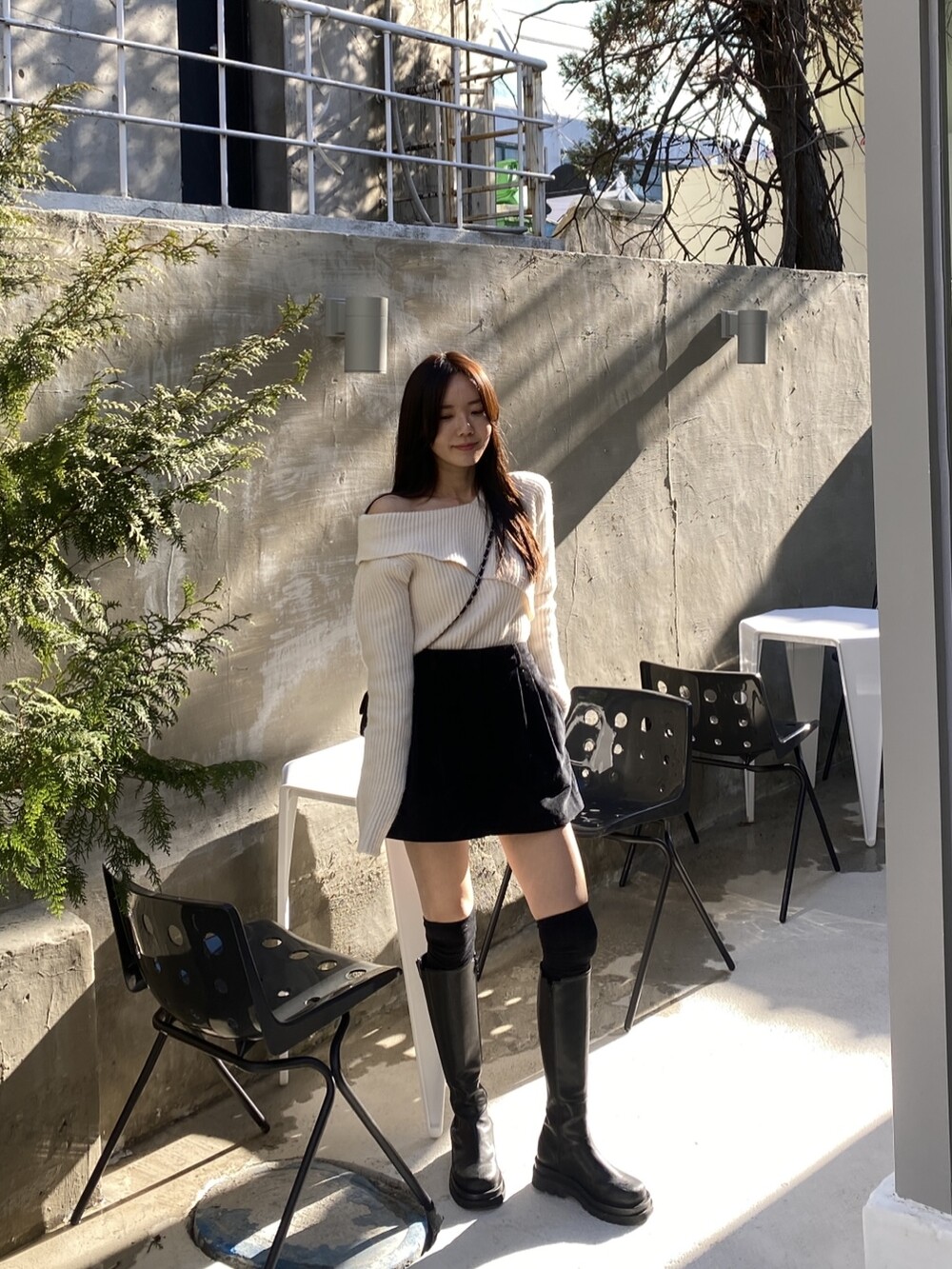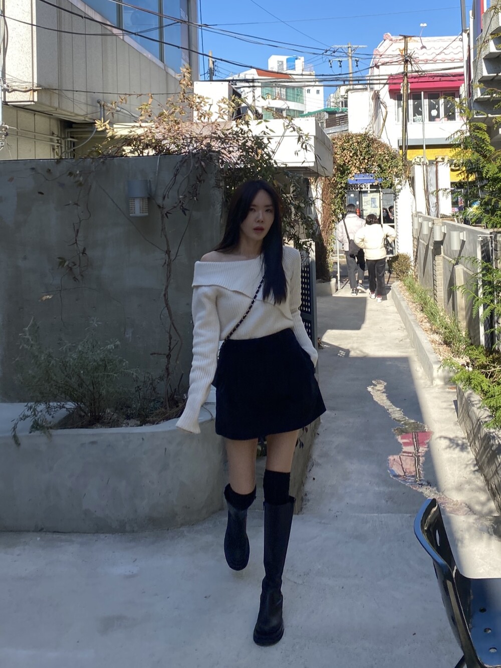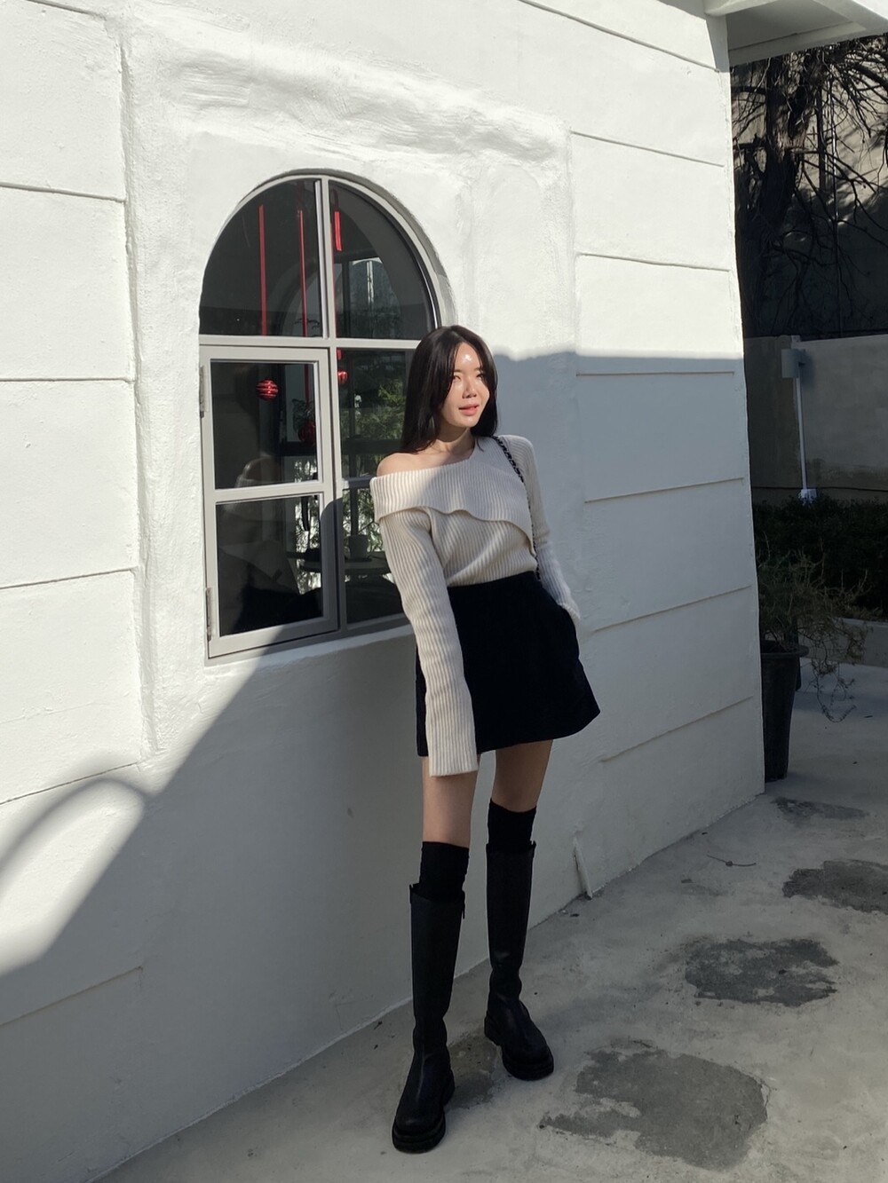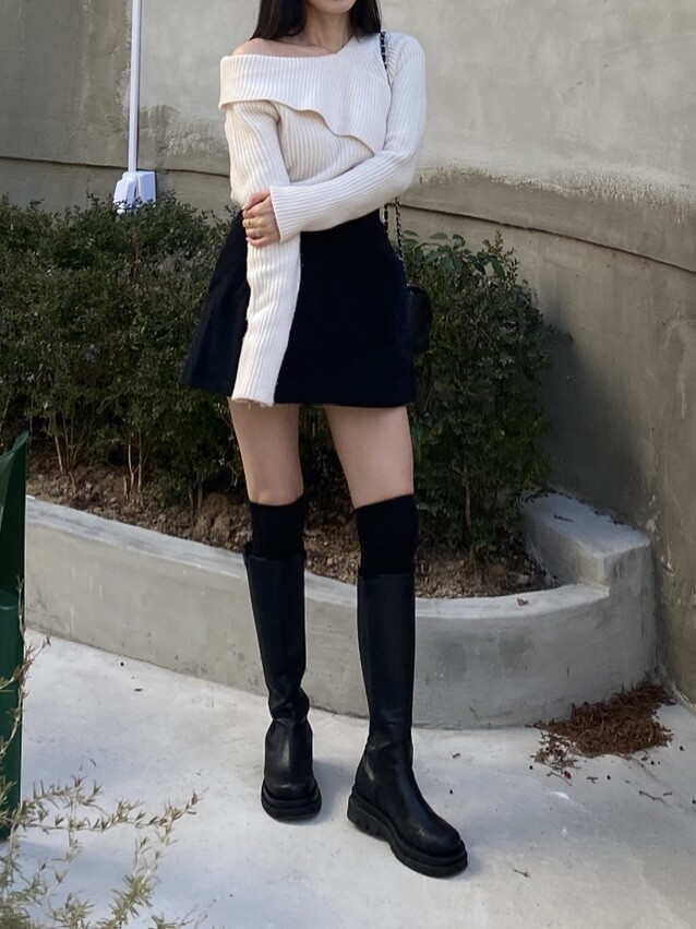 어깨라인을 드러내주는 언발 스타일의 오프숄더 넥의