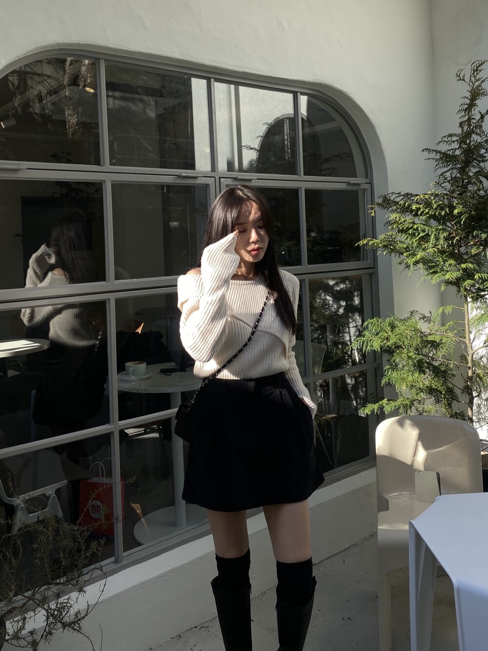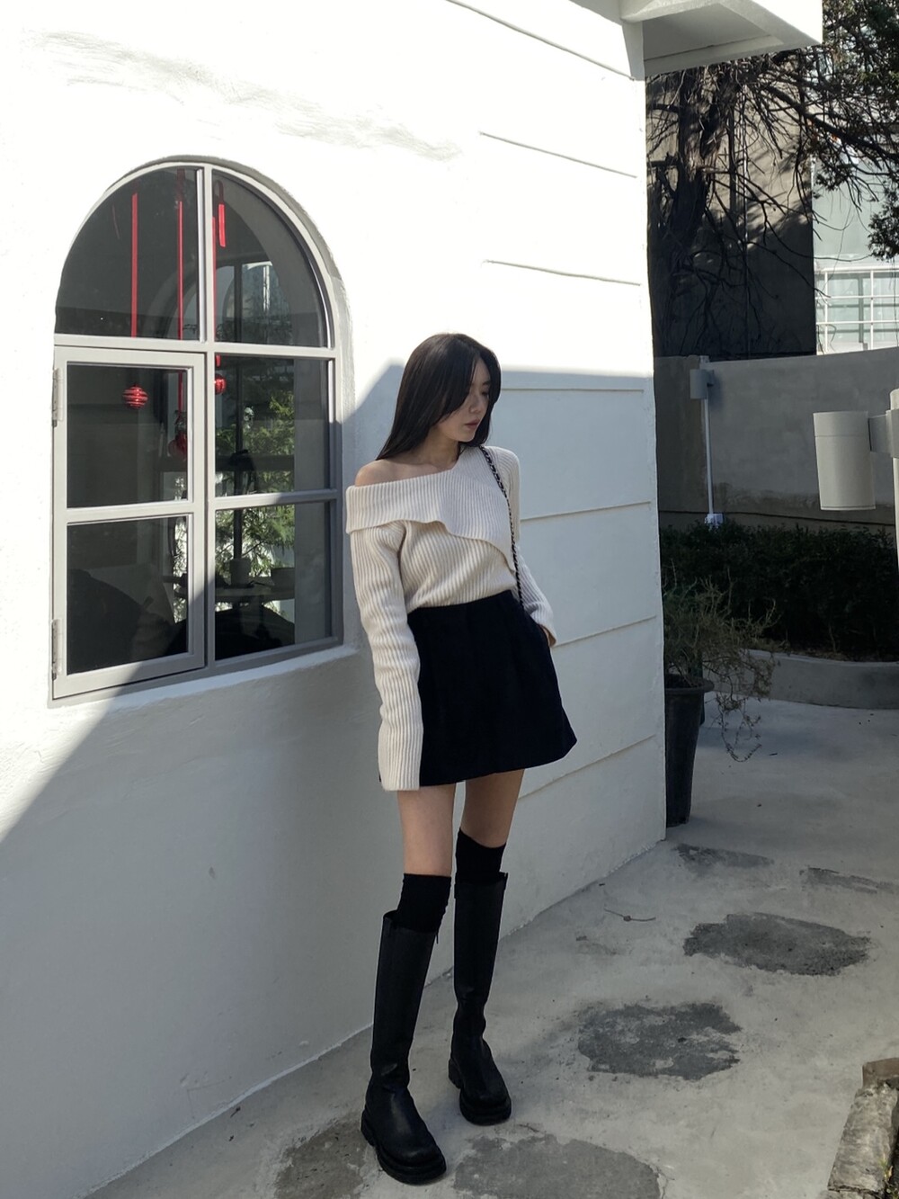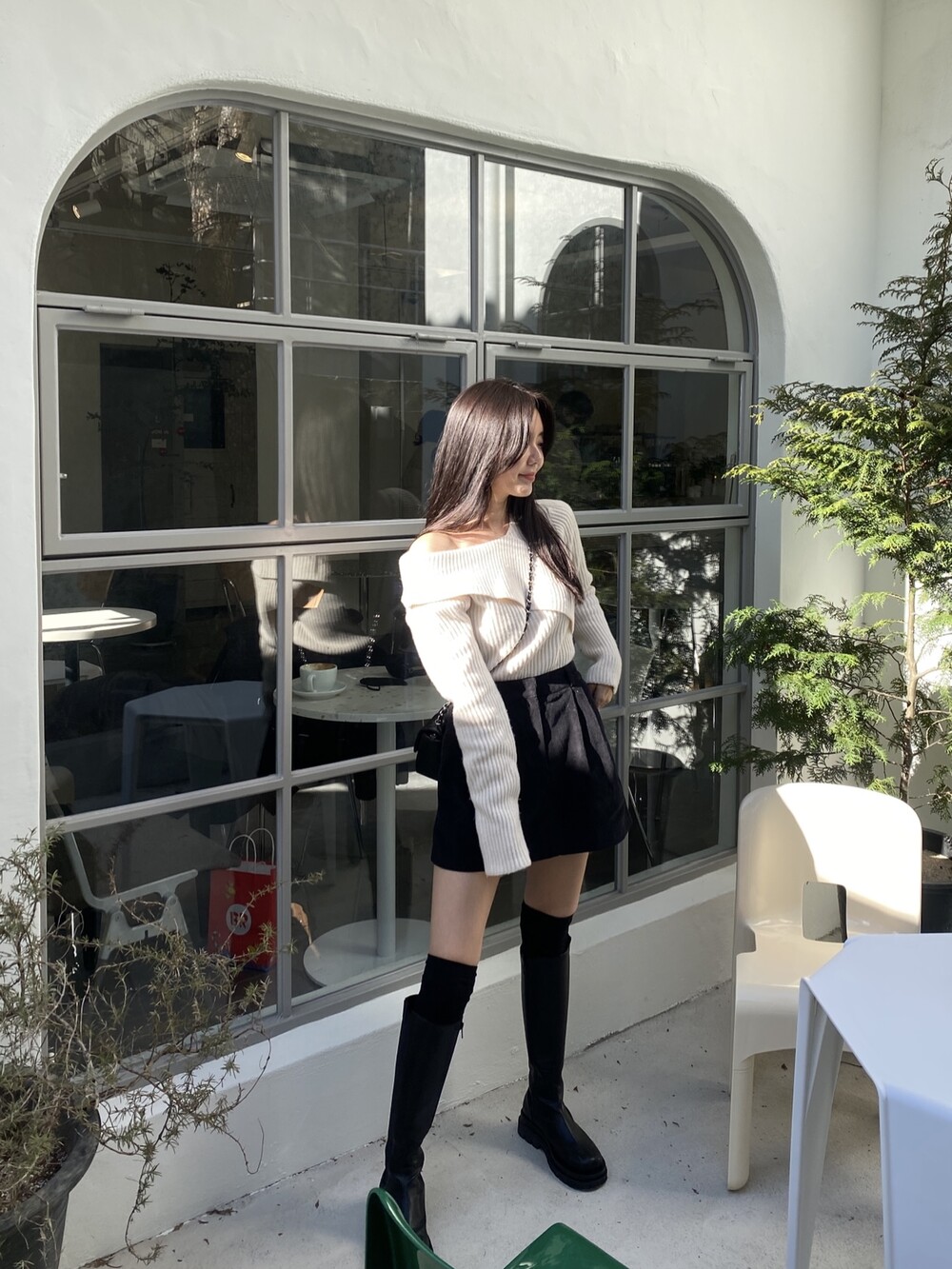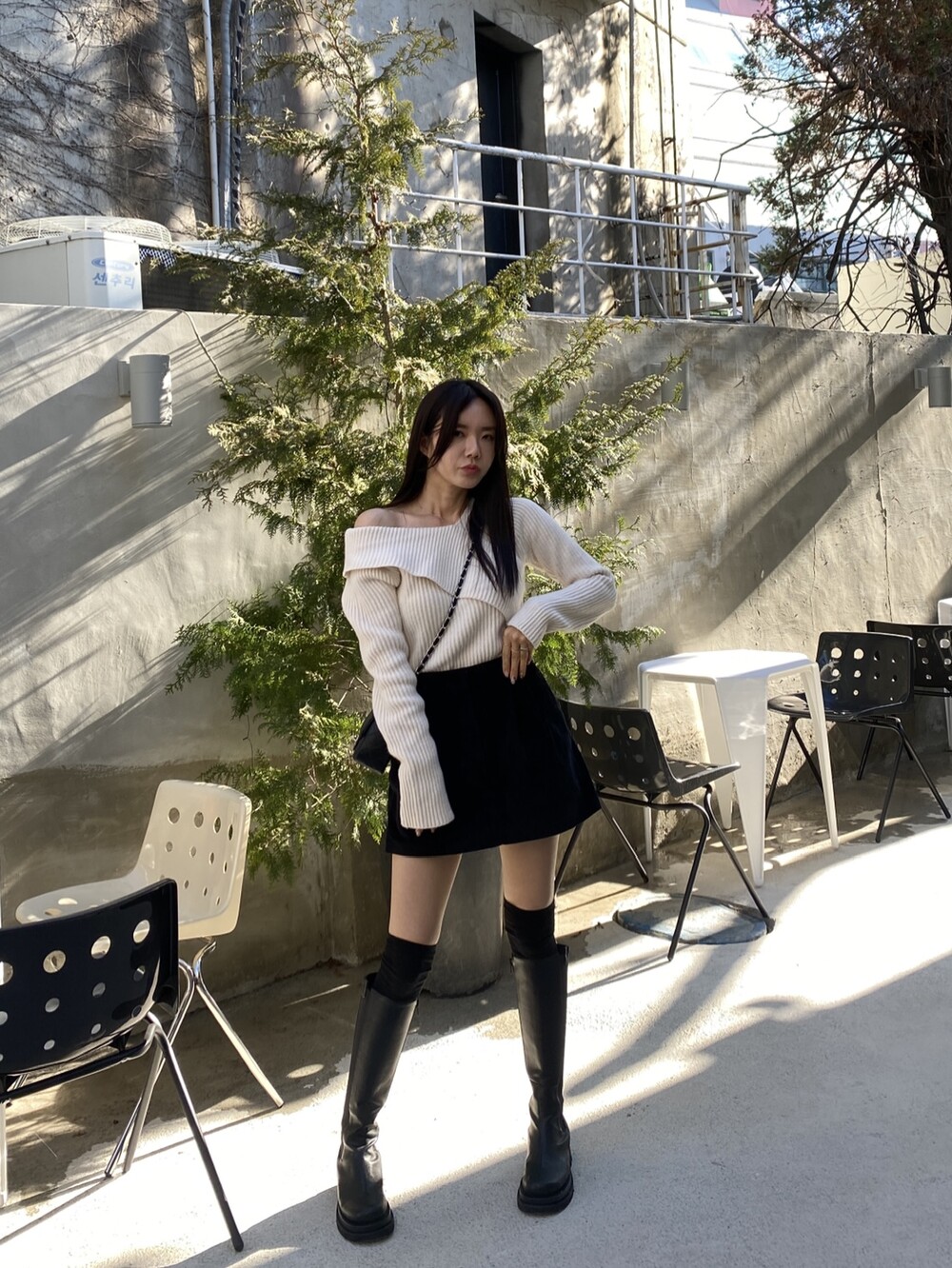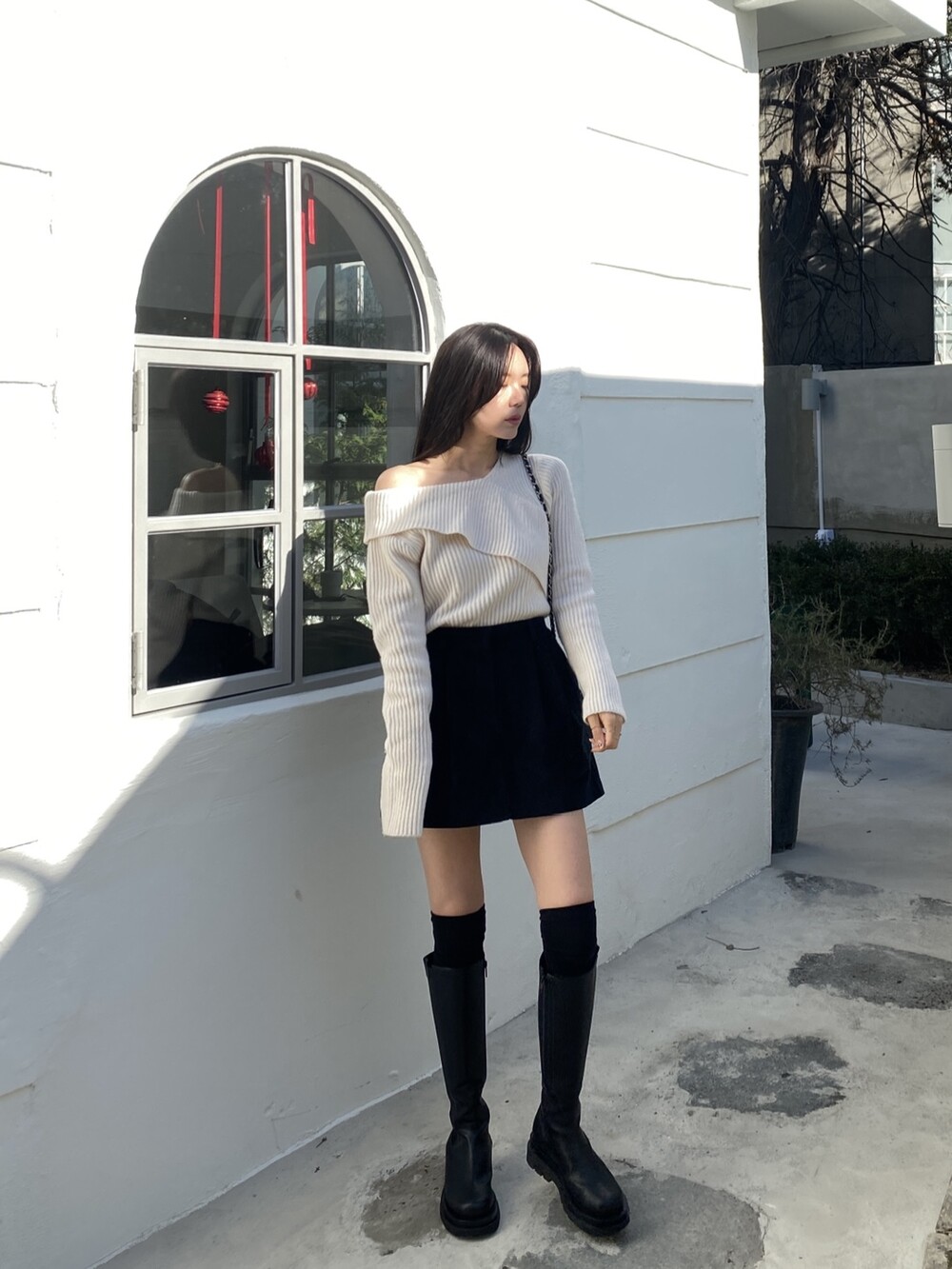 어깨라인을 드러내주는 언발 스타일의 오프숄더 넥의