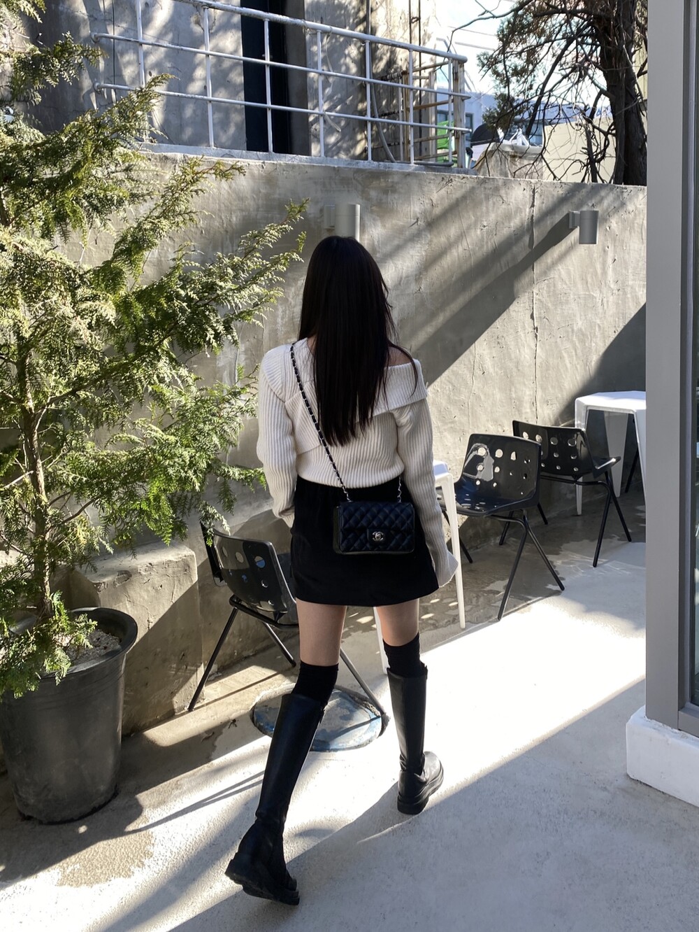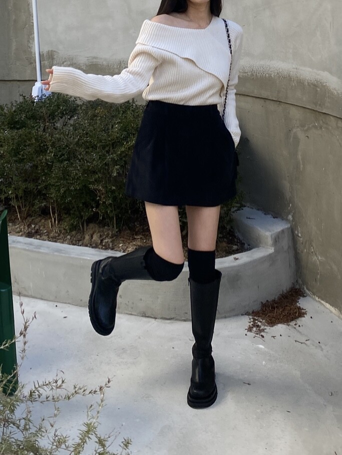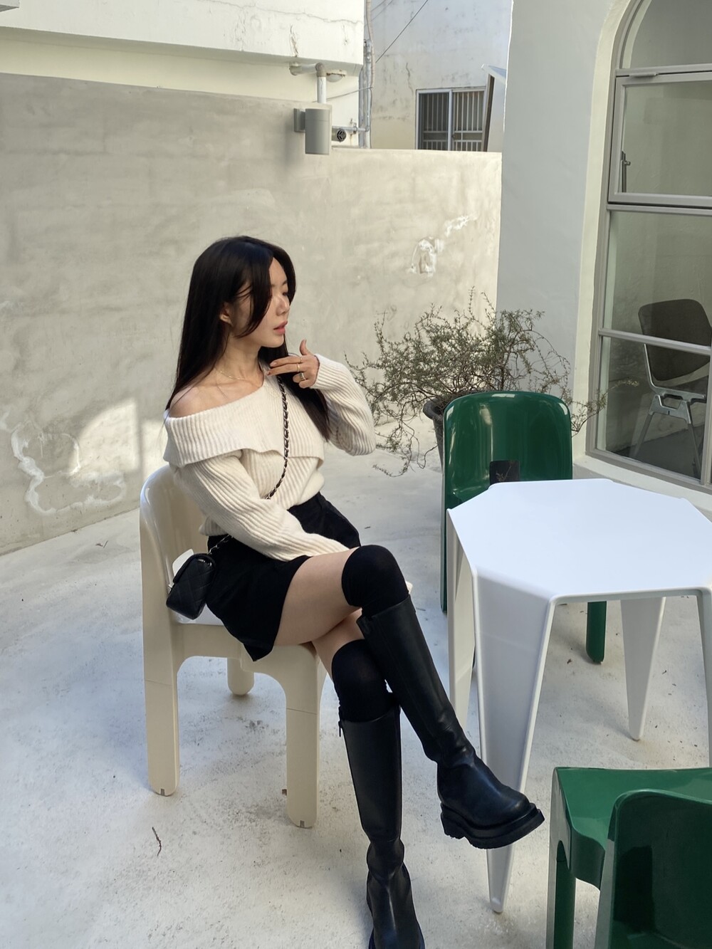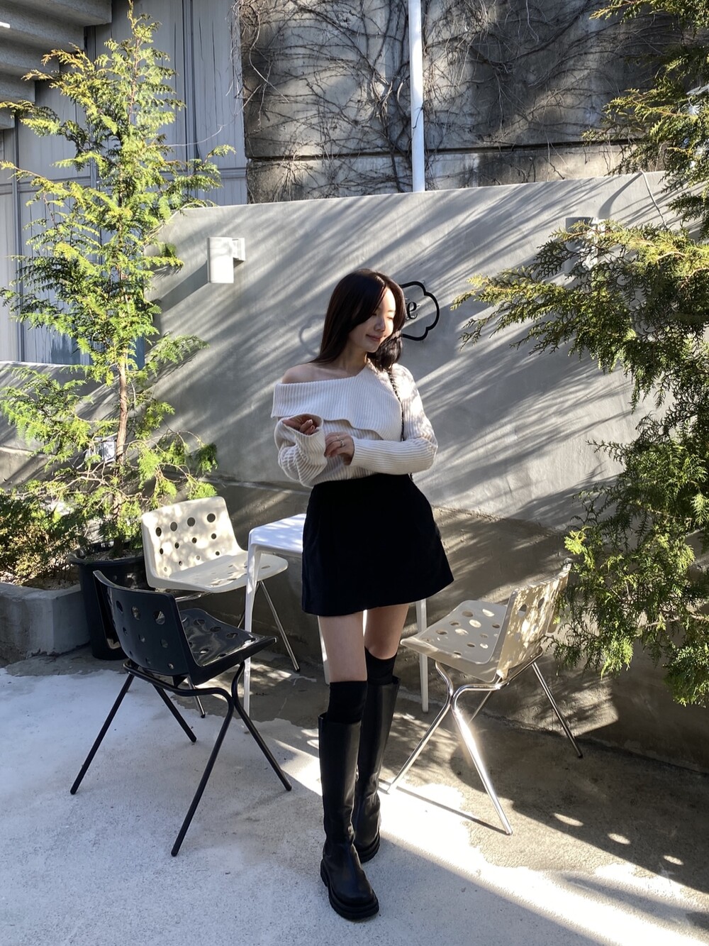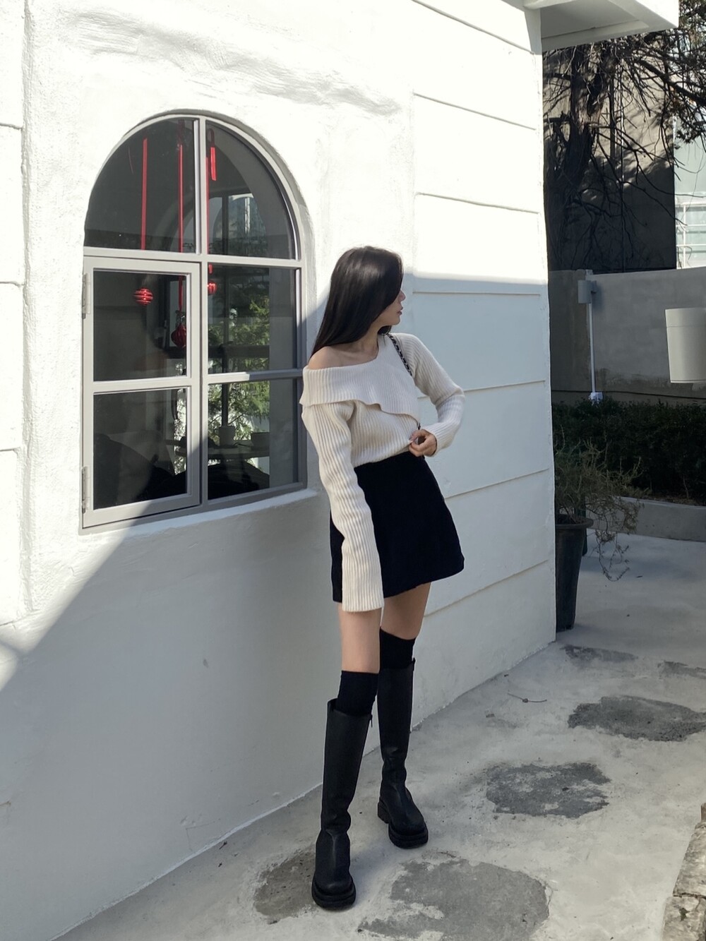 어깨라인을 드러내주는 언발 스타일의 오프숄더 넥의